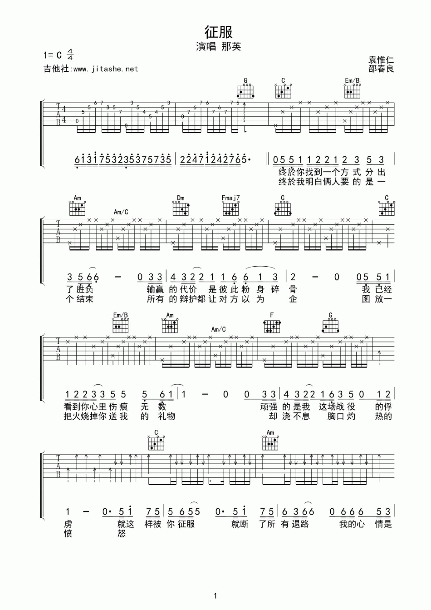 曲谱介绍: 那英《征服》吉他谱 C调版本