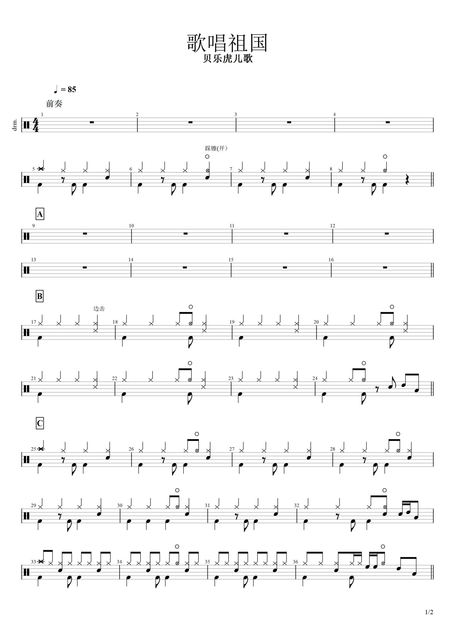 • 歌唱祖国鼓谱 - 贝乐虎 - 架子鼓谱第1张