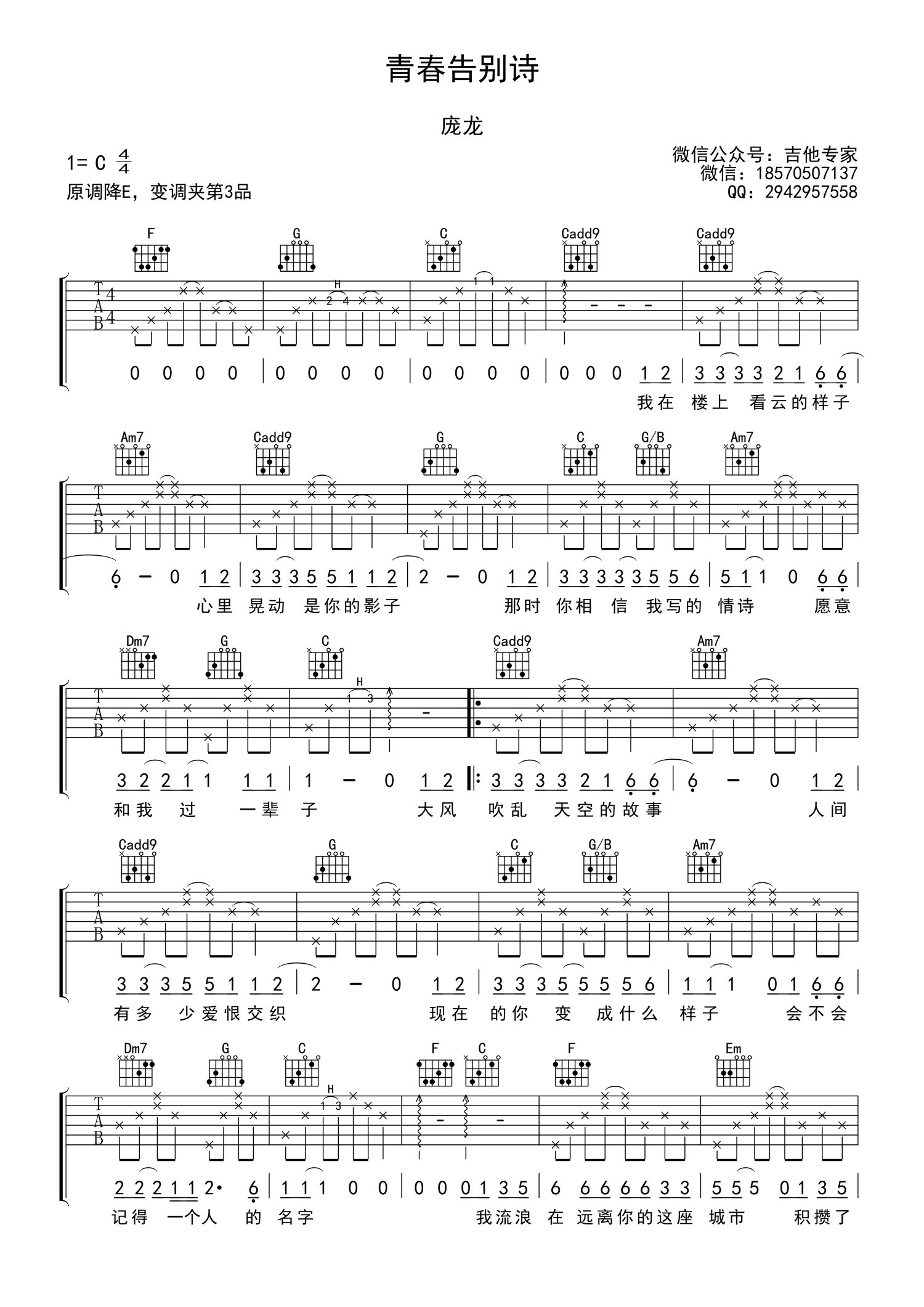 曲谱介绍: 于和伟/庞龙《青春告别诗》吉他谱_C调吉他弹唱谱
