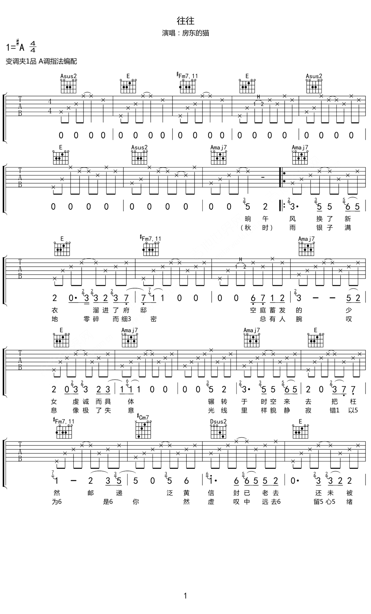 往往吉他谱 - 房东的猫 - A调吉他弹唱谱