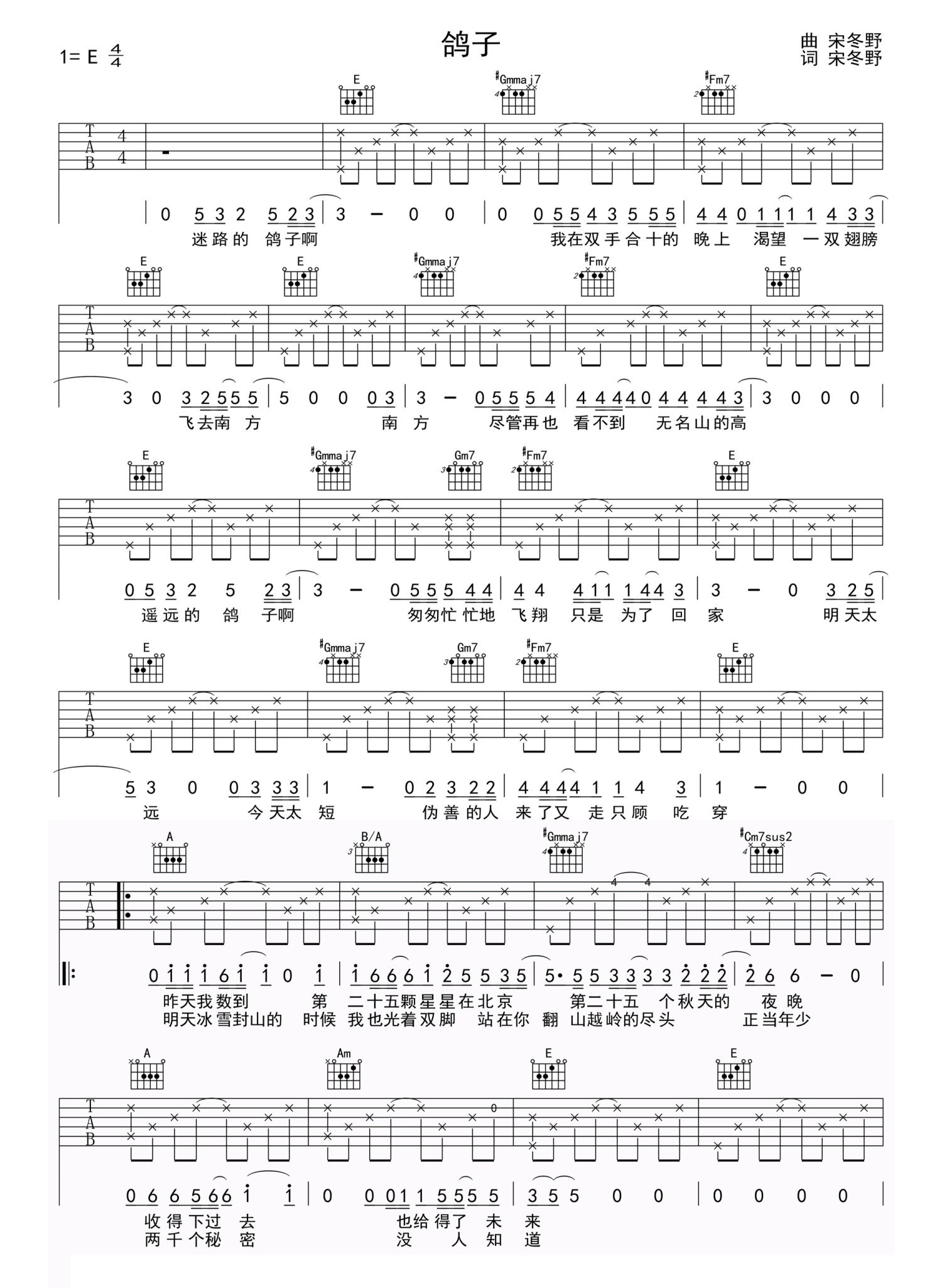 鸽子吉他谱 - 宋冬野 - E调吉他弹唱谱