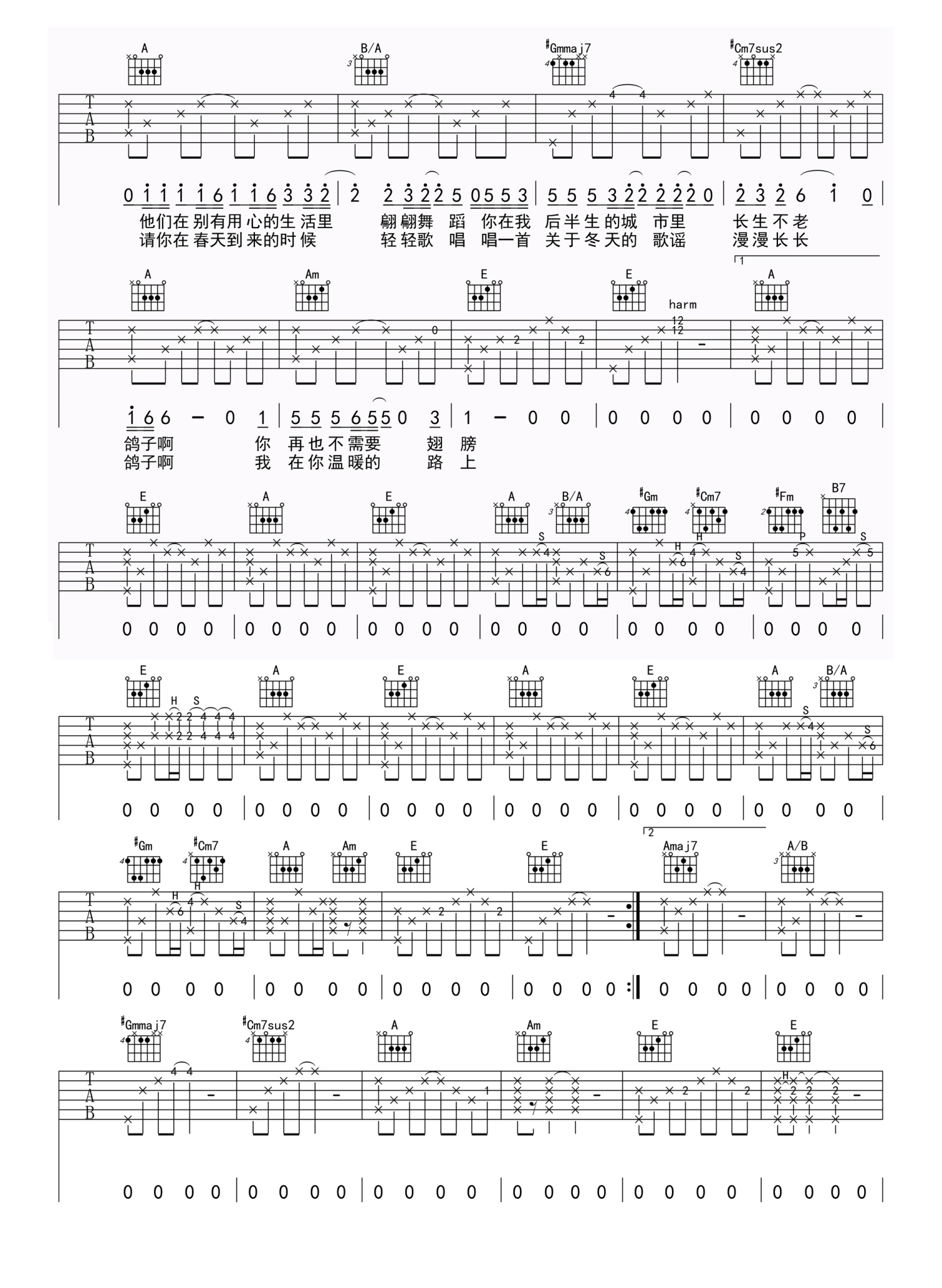 曲谱介绍: 《鸽子》是老宋写给自己在1993年2月2日失去的一只鸽子的,那一日,父亲瞒着他将养的鸽子摔在地上,熬了一锅汤招待客人,很多年后他将它写进了歌里。去年我在偶然间读到刘若英的文字,她在自己的乐评《从宋冬野的歌中,听到…》里写到:“你应该也有这种体验,在某一段时间里,总是重复听着同一首歌,忘记听了几遍,听到觉得自己像消失了,钻进那歌里去了,那一阵子,我的主题曲是宋冬野的《鸽子》。”一个是流行圈炙手可热的奶茶,一个是民谣圈的宋胖子,我很乐见自己的两位偶像能有一丝关联,且带给我很多共鸣,这也是我唯一一次感受到他们离我如此之近。是的,宋冬野烟熏低音炮的声线自带三分忧伤,他的每一首歌都在低沉婉转地讲述一些我未曾体验过的经历,那种被我称作孤独与渴望的情绪,在《鸽子》里的感受最强烈。
