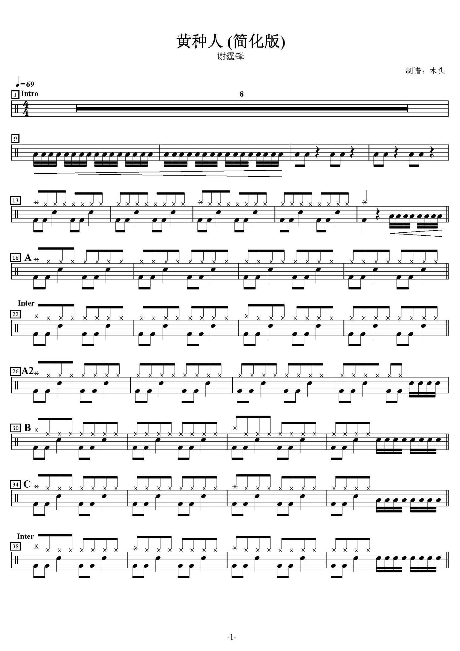 • 黄种人鼓谱 - 谢霆锋 - 架子鼓谱 - 简化版第1张