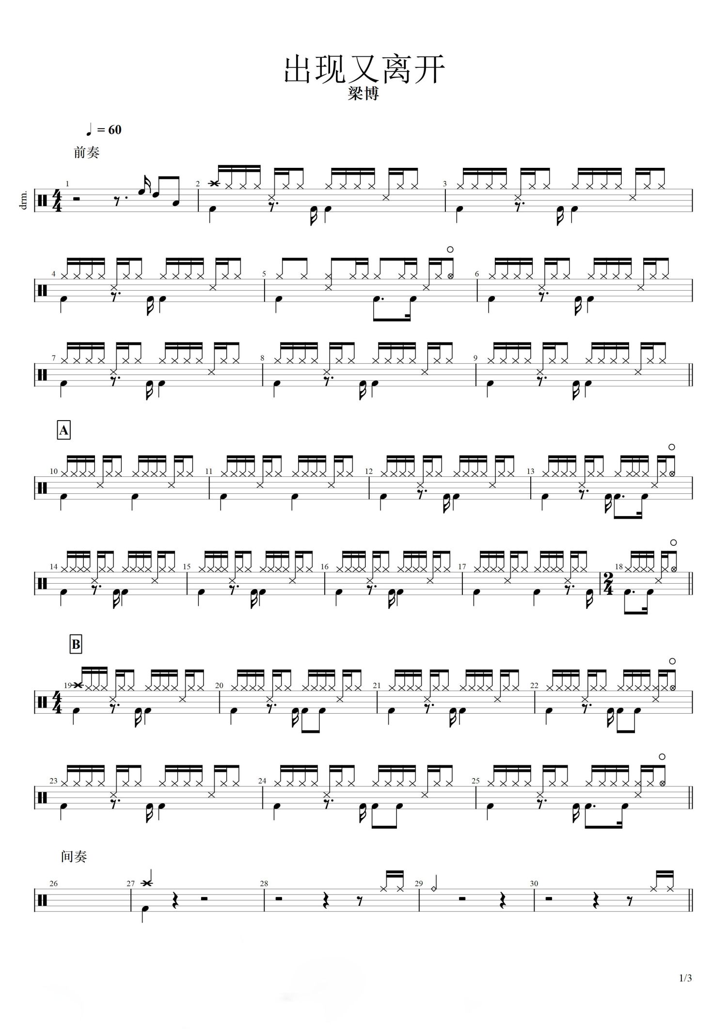• 出现又离开鼓谱 - 梁博 - 架子鼓谱第1张