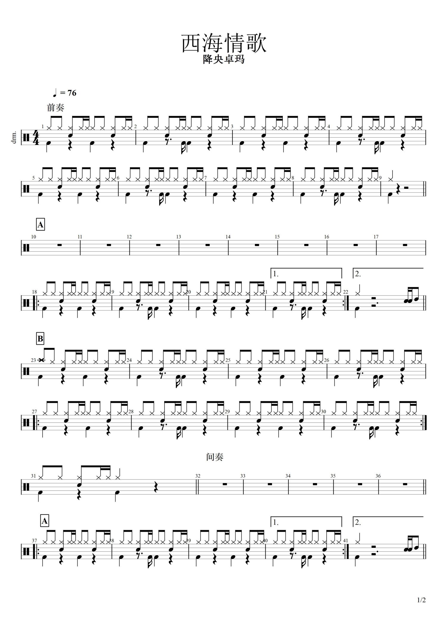 • 西海情歌鼓谱 - 降央卓玛 - 架子鼓谱第1张