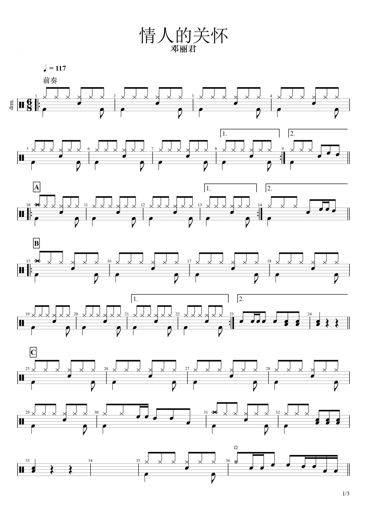 • 情人的关怀鼓谱 - 邓丽君 - 架子鼓谱第1张