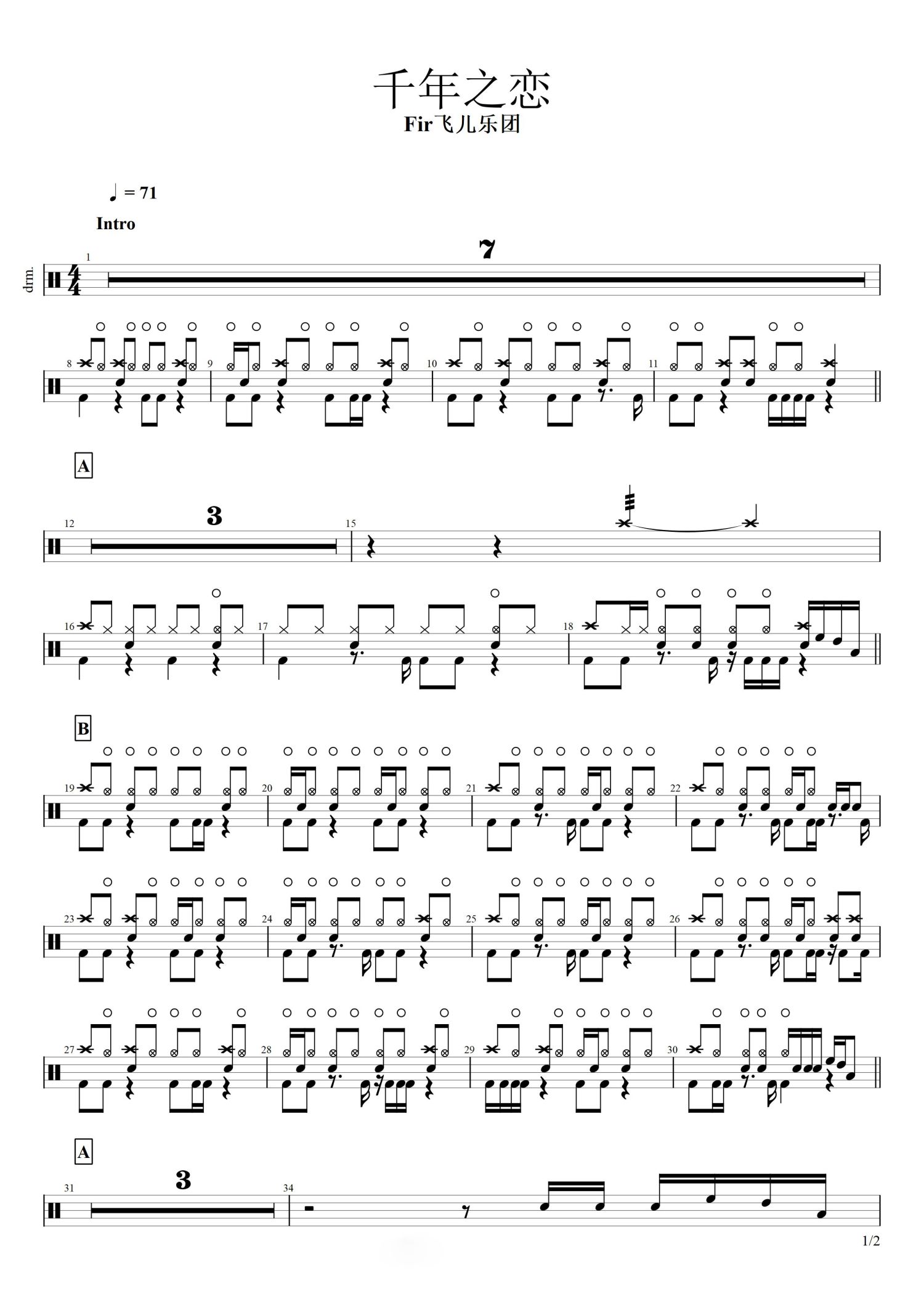 • 千年之恋鼓谱 - Fir飞儿乐团 - 架子鼓谱第1张