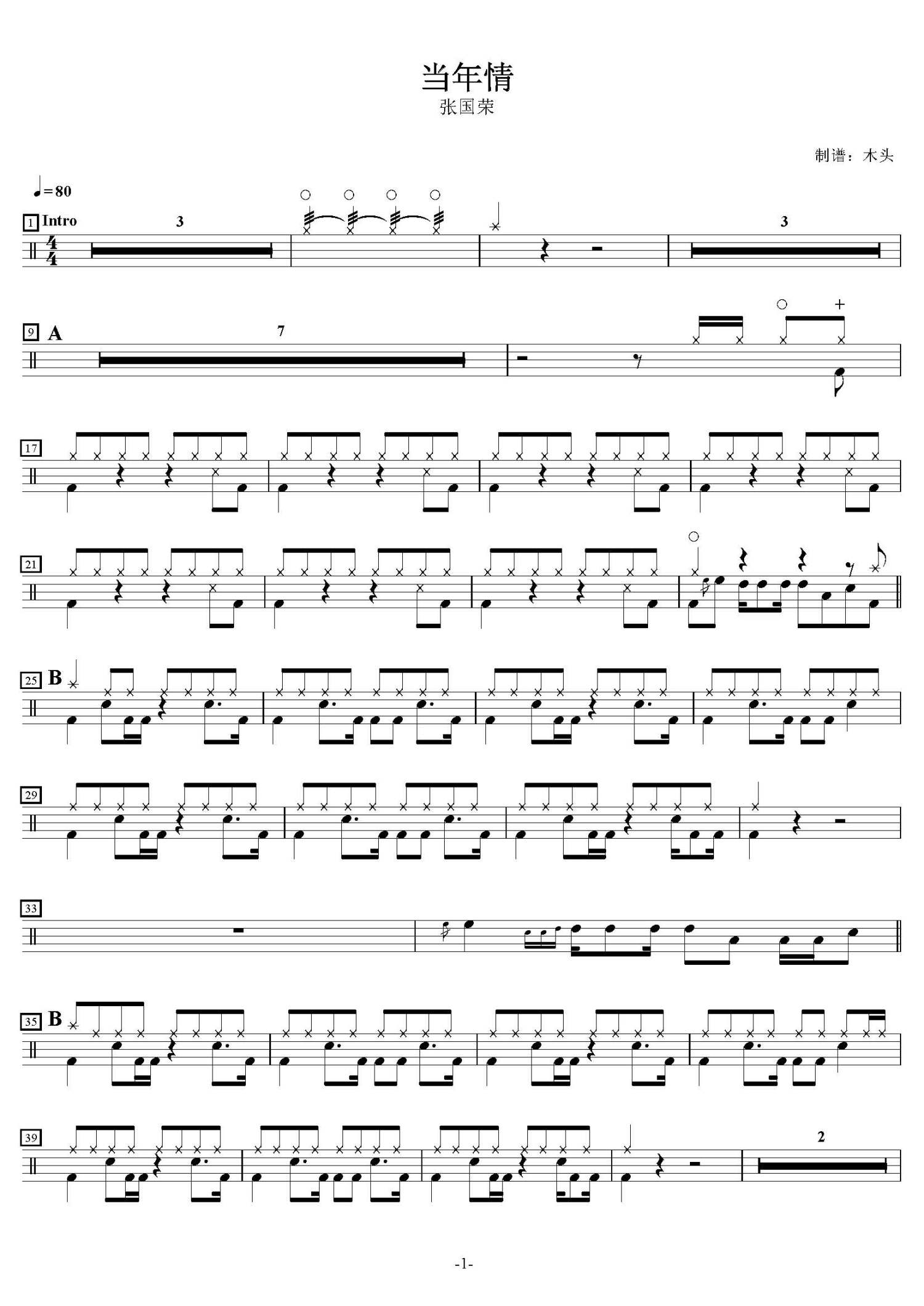 • 当年情鼓谱 - 张国荣 - 架子鼓谱第1张