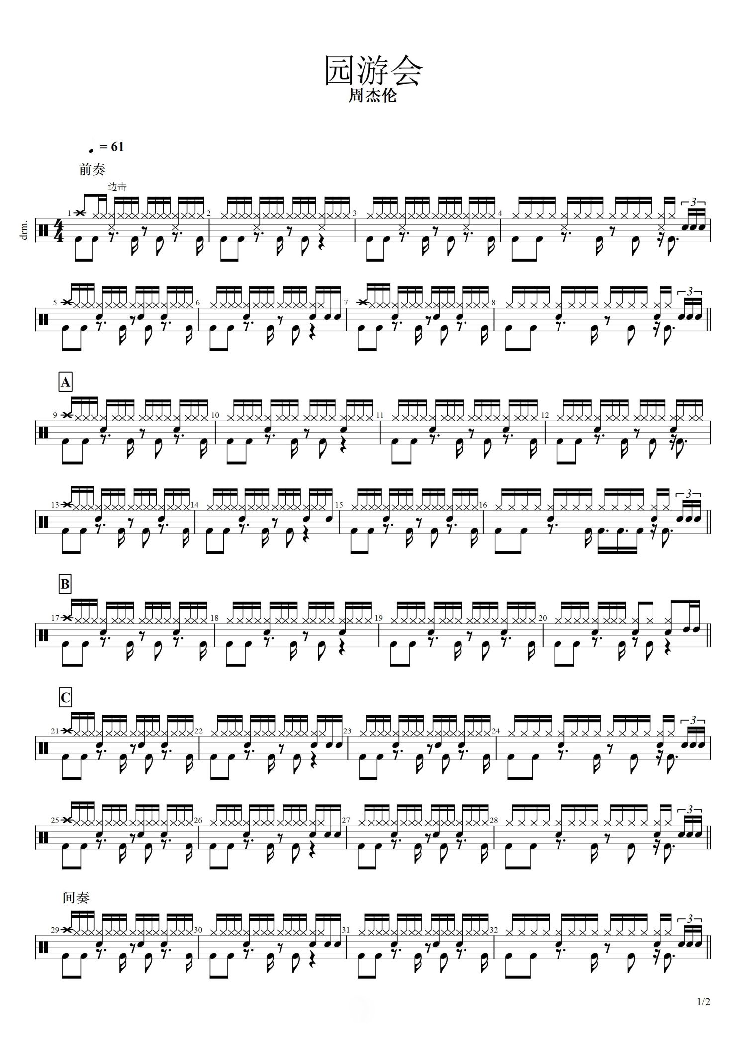 园游会鼓谱 - 周杰伦 - 架子鼓谱