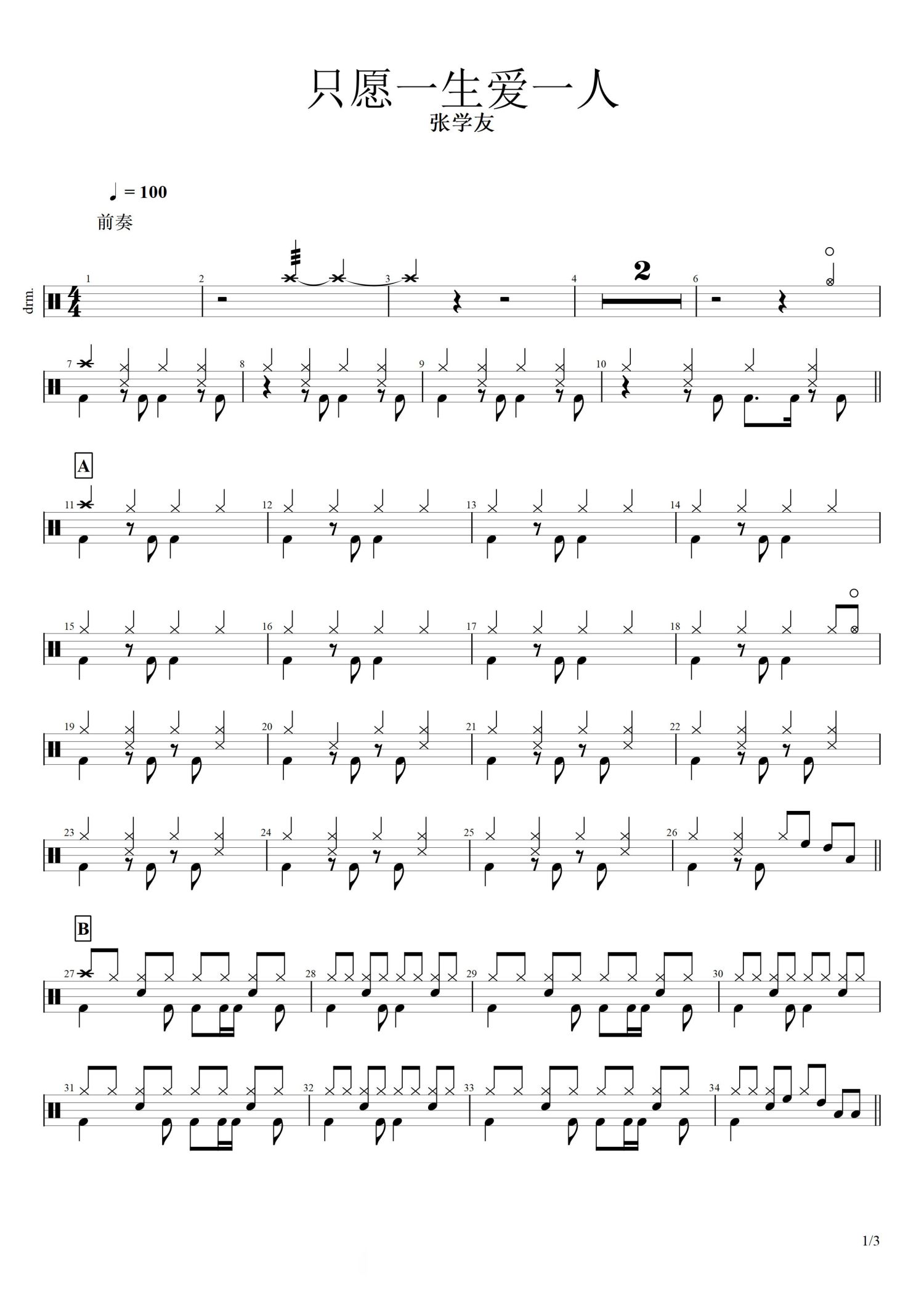 • 只愿一生爱一人鼓谱 - 张学友 - 架子鼓谱第1张