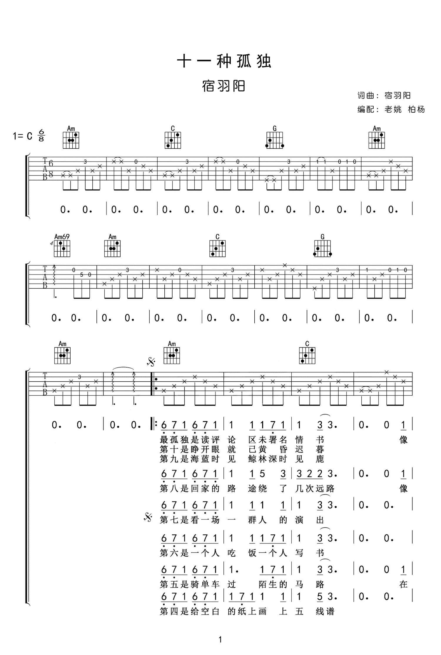 十一种孤独吉他谱 - 宿羽阳 - C调吉他弹唱谱