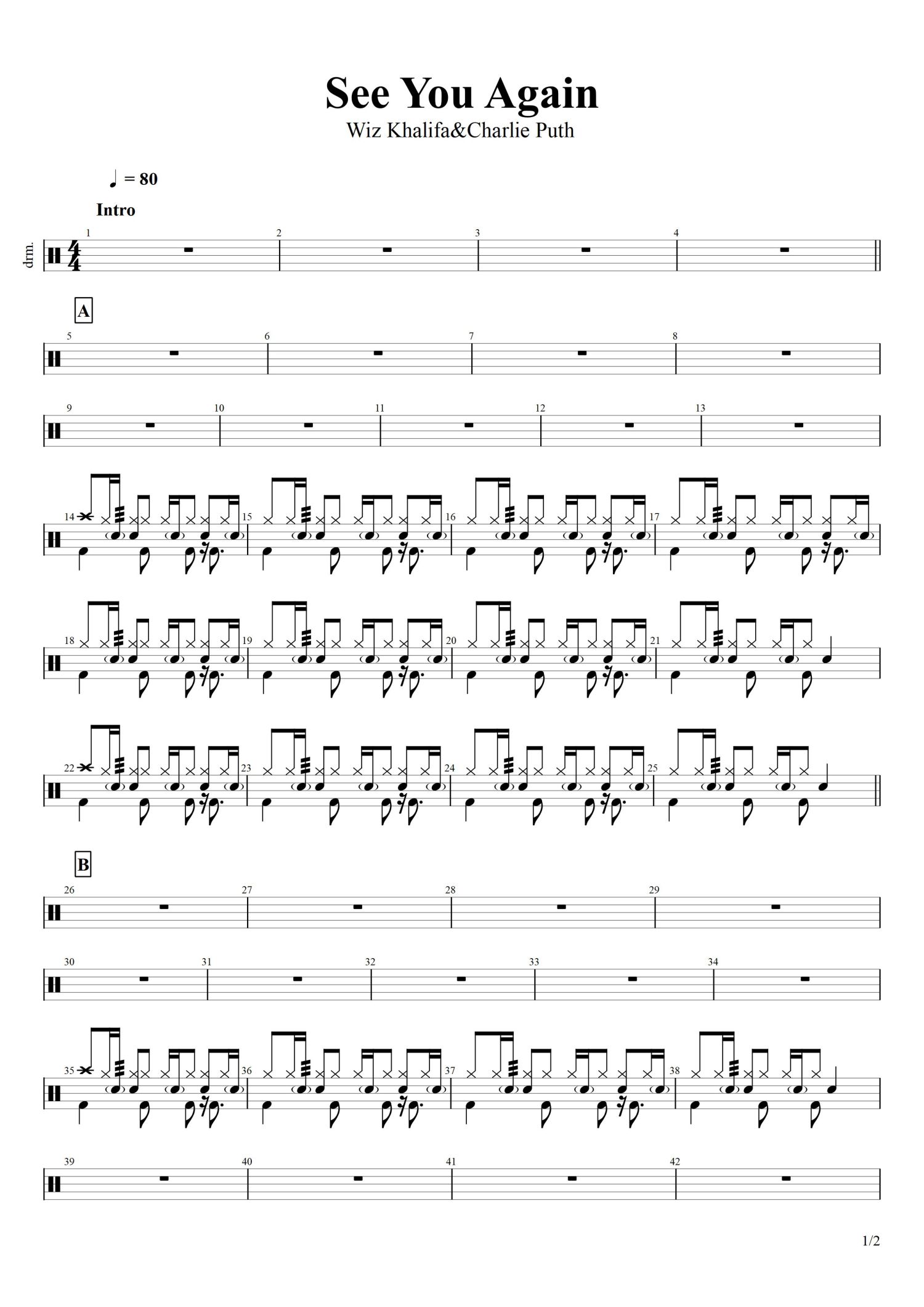 • See You Again鼓谱 - 维兹·卡利法与歌手查理·普斯 - 架子鼓谱第1张