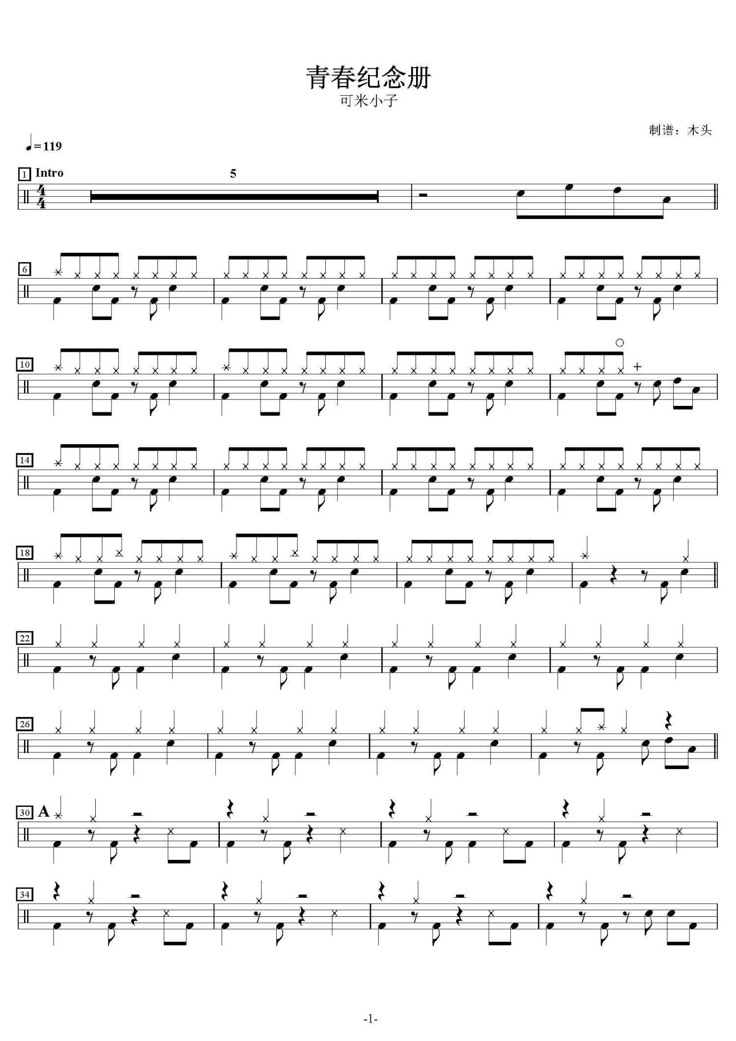 • 青春纪念册鼓谱 - 可米小子 - 架子鼓谱第1张