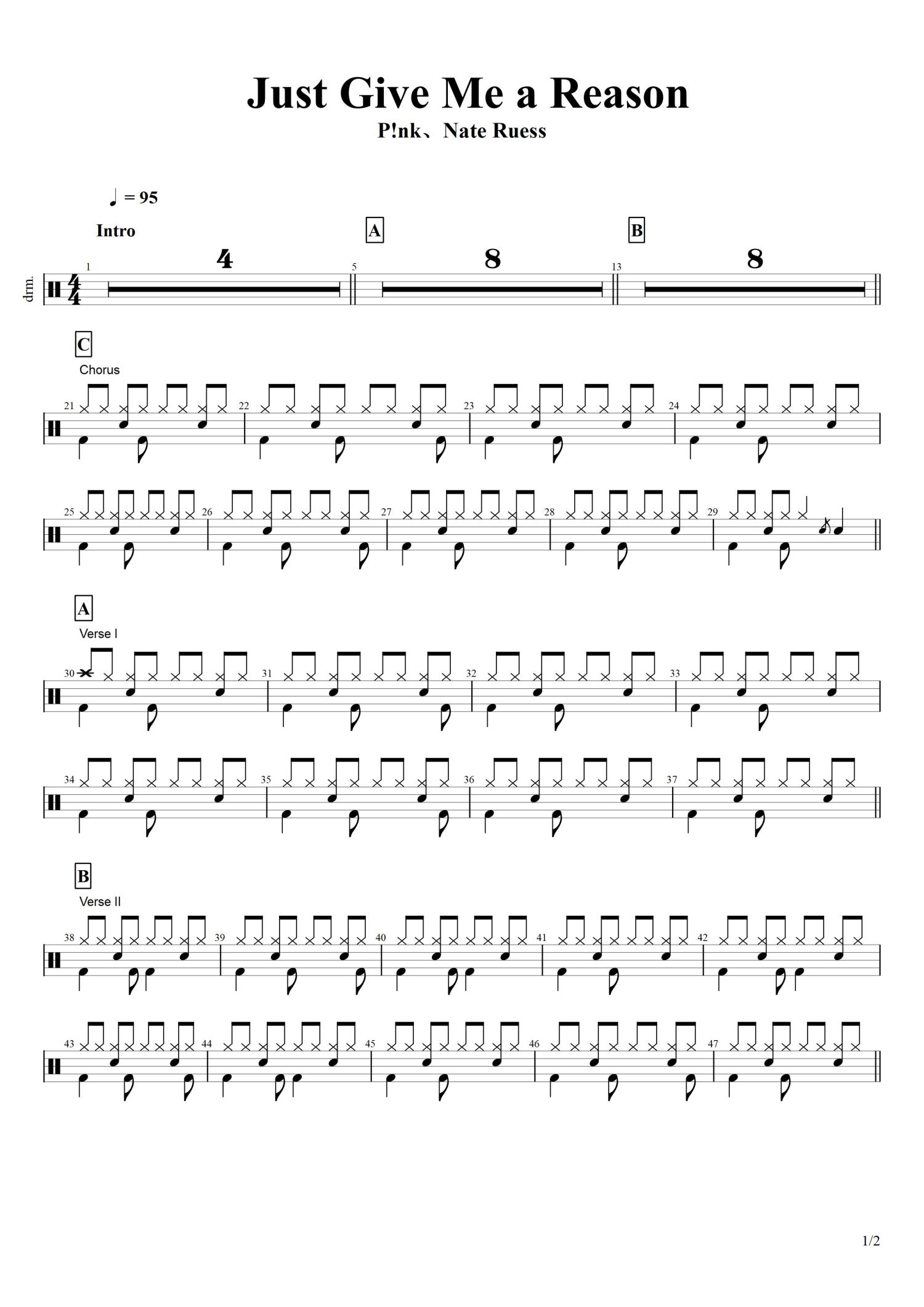 • Just Give Me a Reason鼓谱 - P!nk/奈特·罗伊斯 - 架子鼓谱第1张