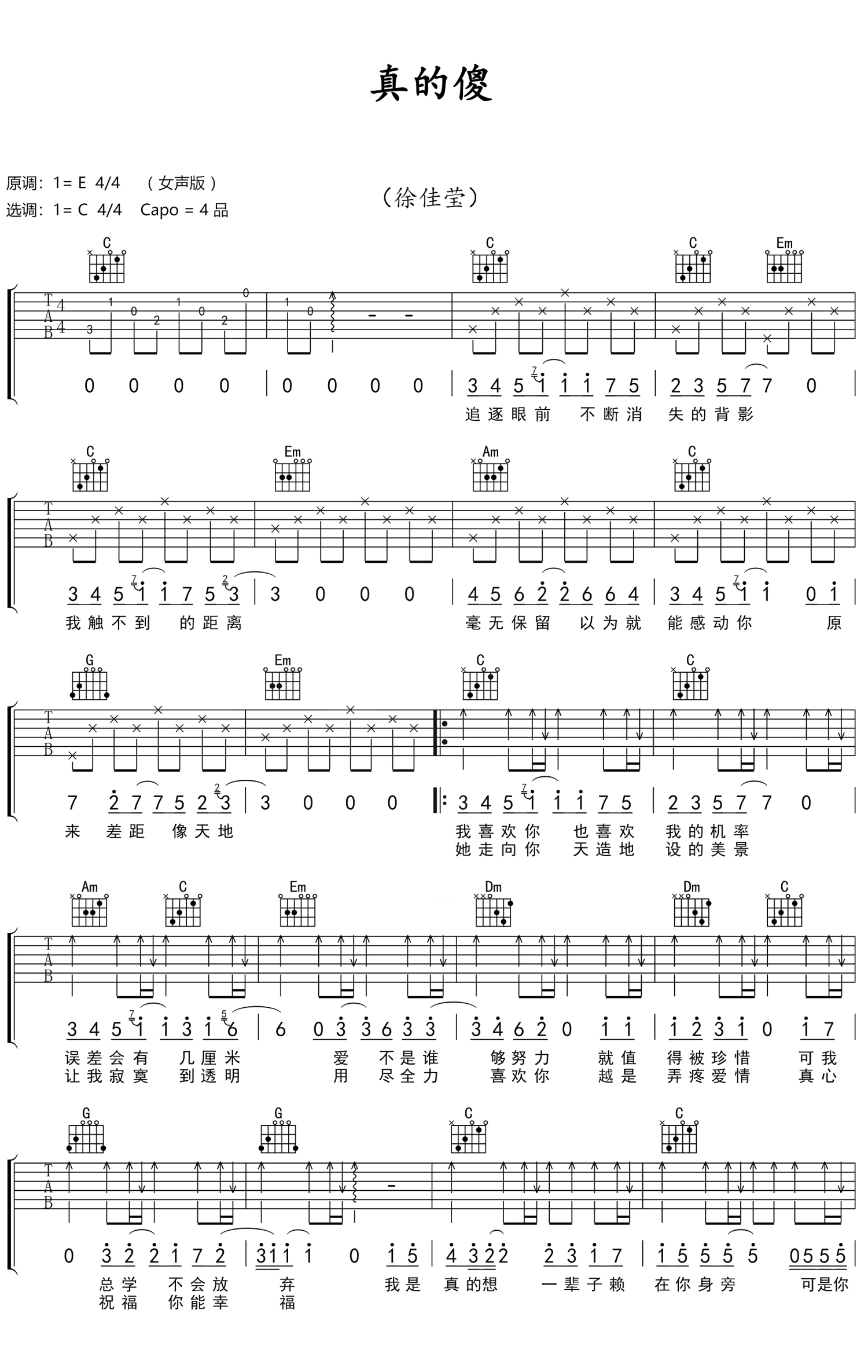 真的傻吉他谱 - 徐佳莹 - C调吉他弹唱谱