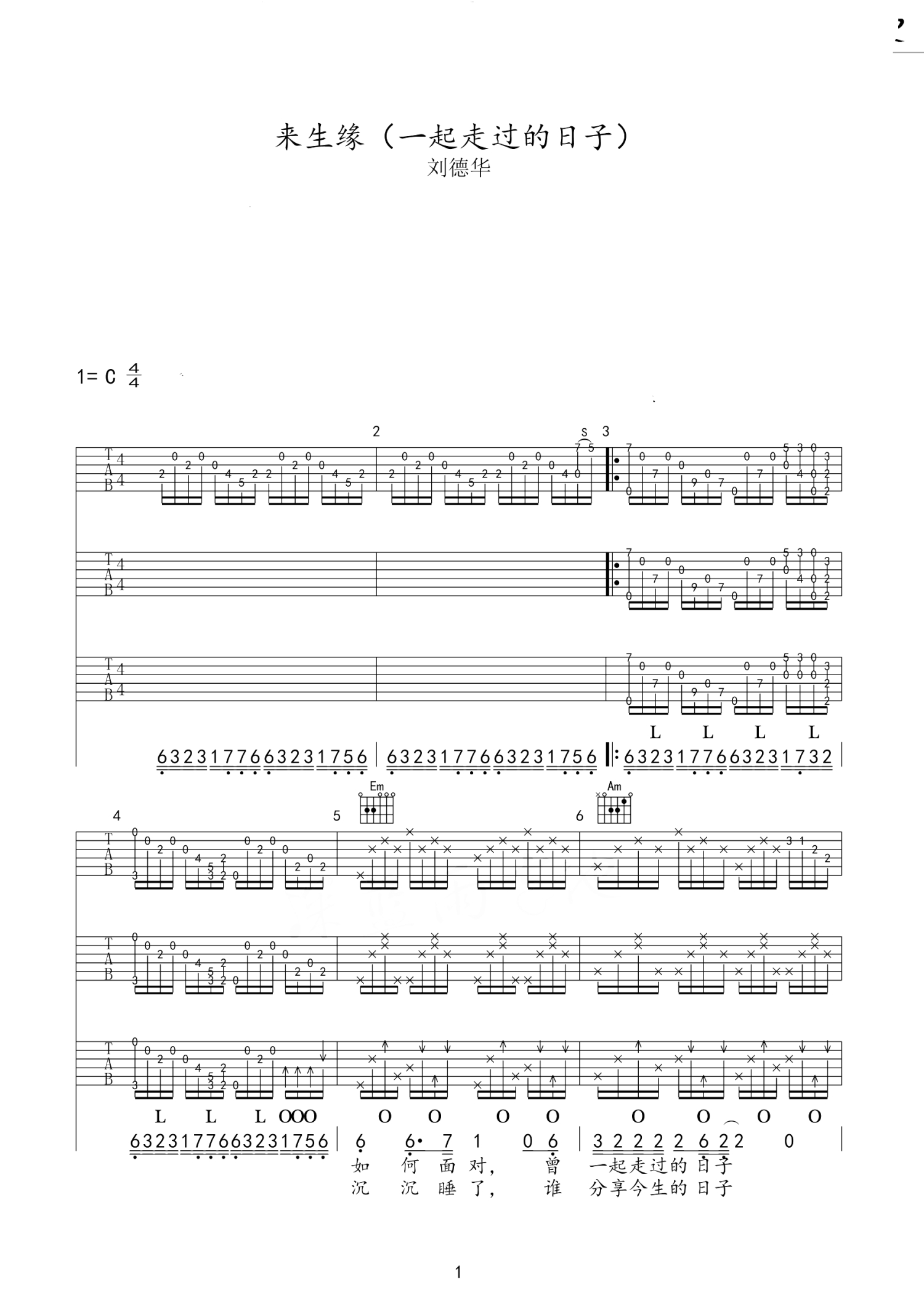 一起走过的日子吉他谱 - 刘德华 - C调吉他弹唱谱
