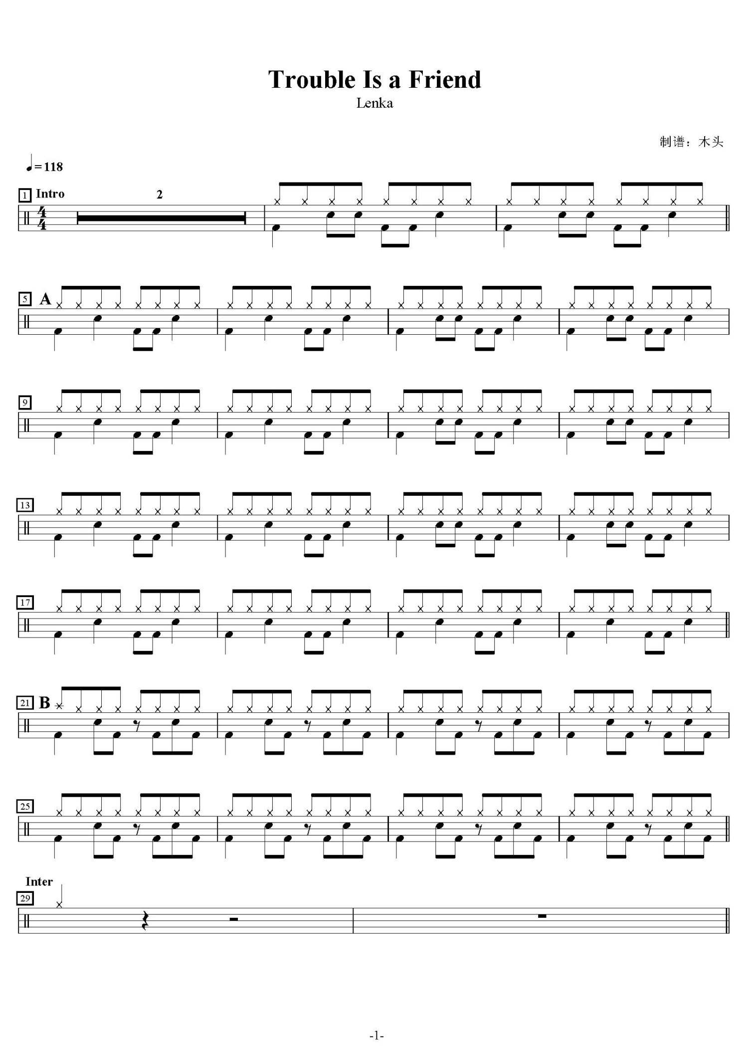 • Trouble Is a Friend鼓谱 - Lenka - 架子鼓谱第1张