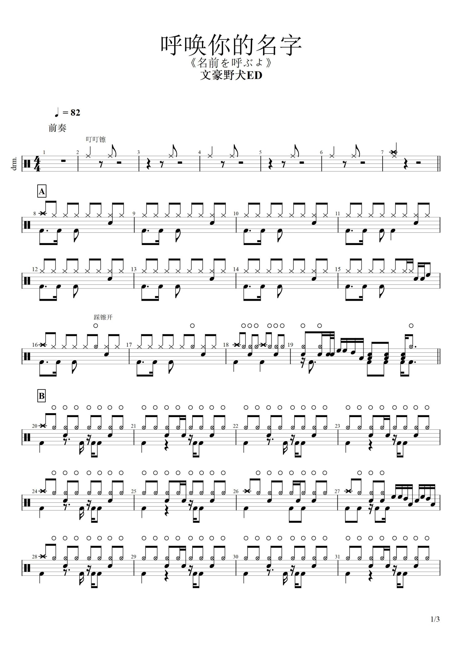 • 呼唤你的名字鼓谱 - 文豪野犬ED - 架子鼓谱第1张
