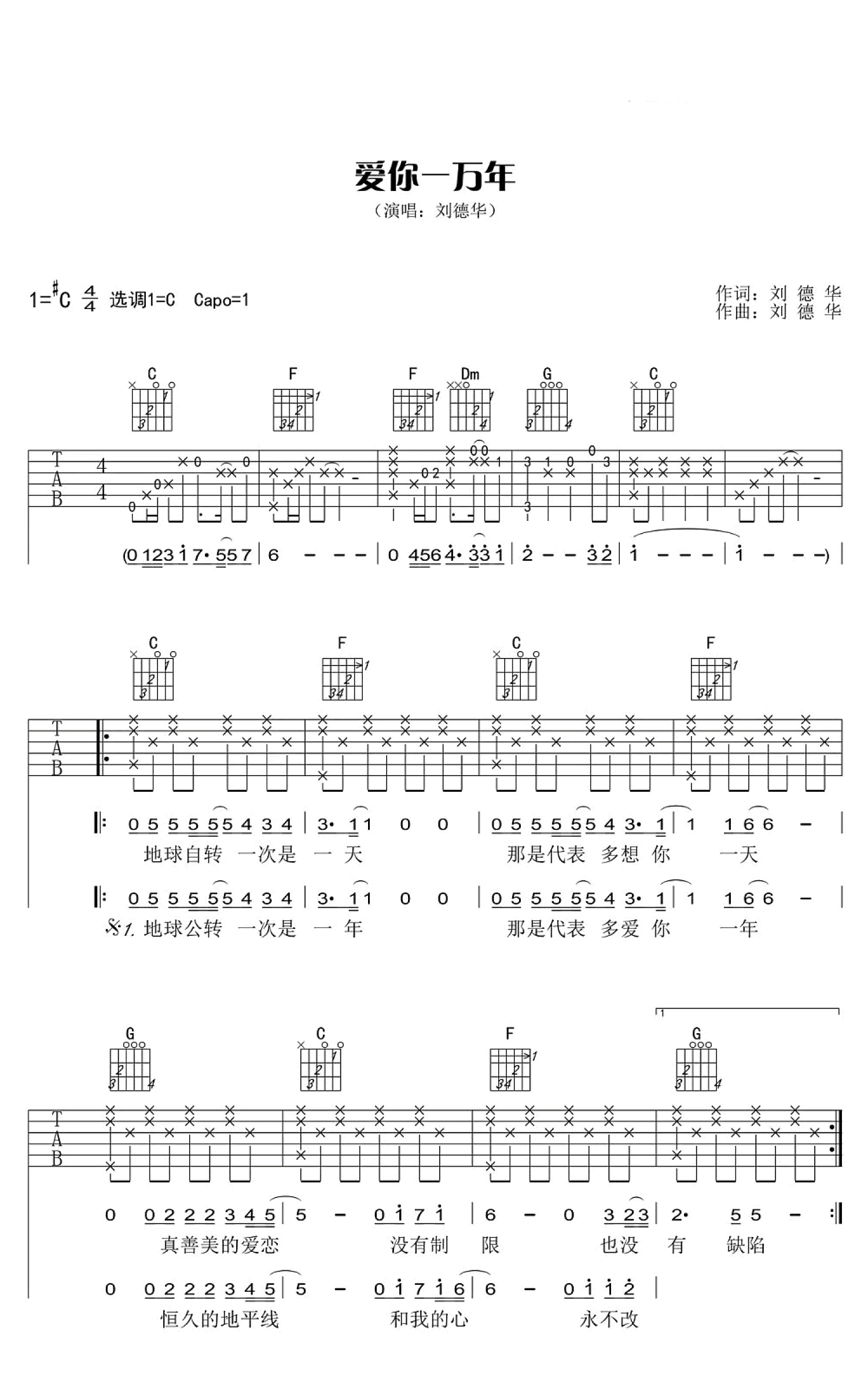爱你一万年吉他谱 - 刘德华 - C调吉他弹唱谱
