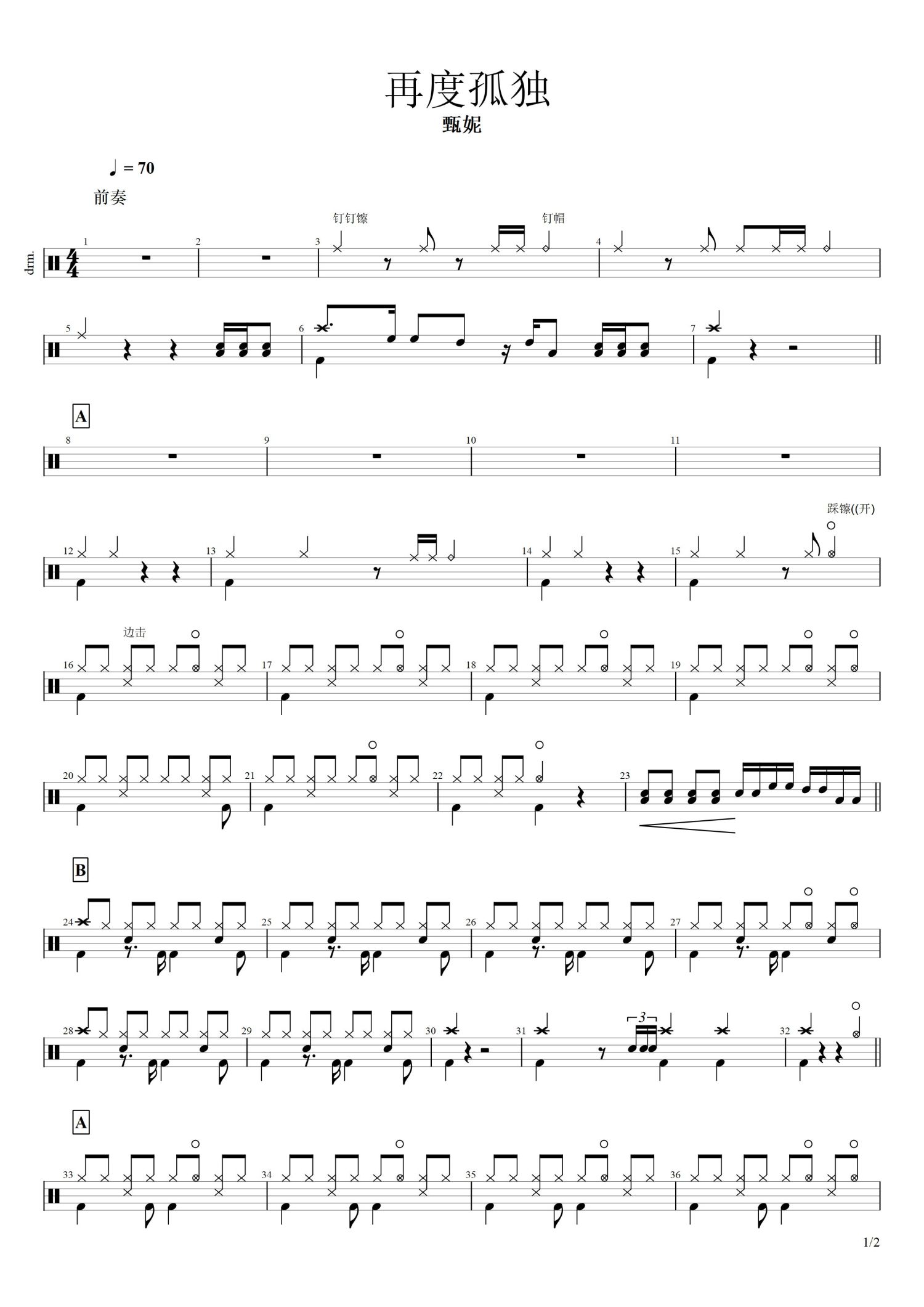• 再度孤独鼓谱 - 甄妮 - 架子鼓谱第1张