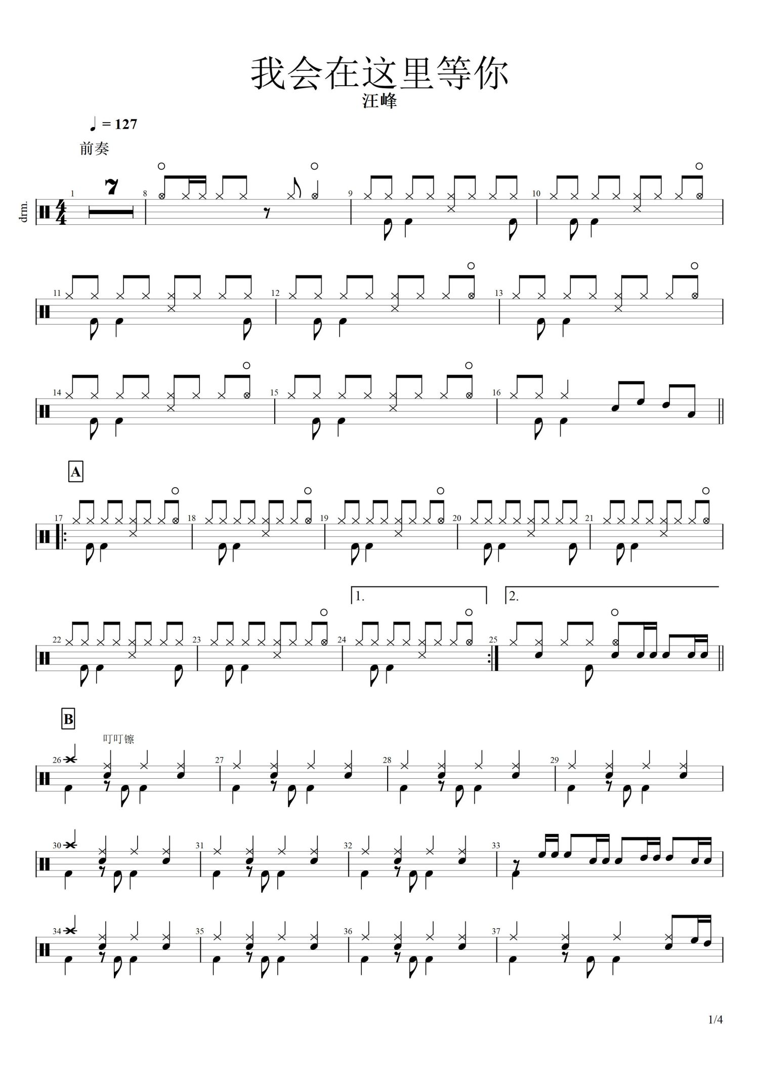 • 我会在这里等你鼓谱 - 汪峰 - 架子鼓谱第1张