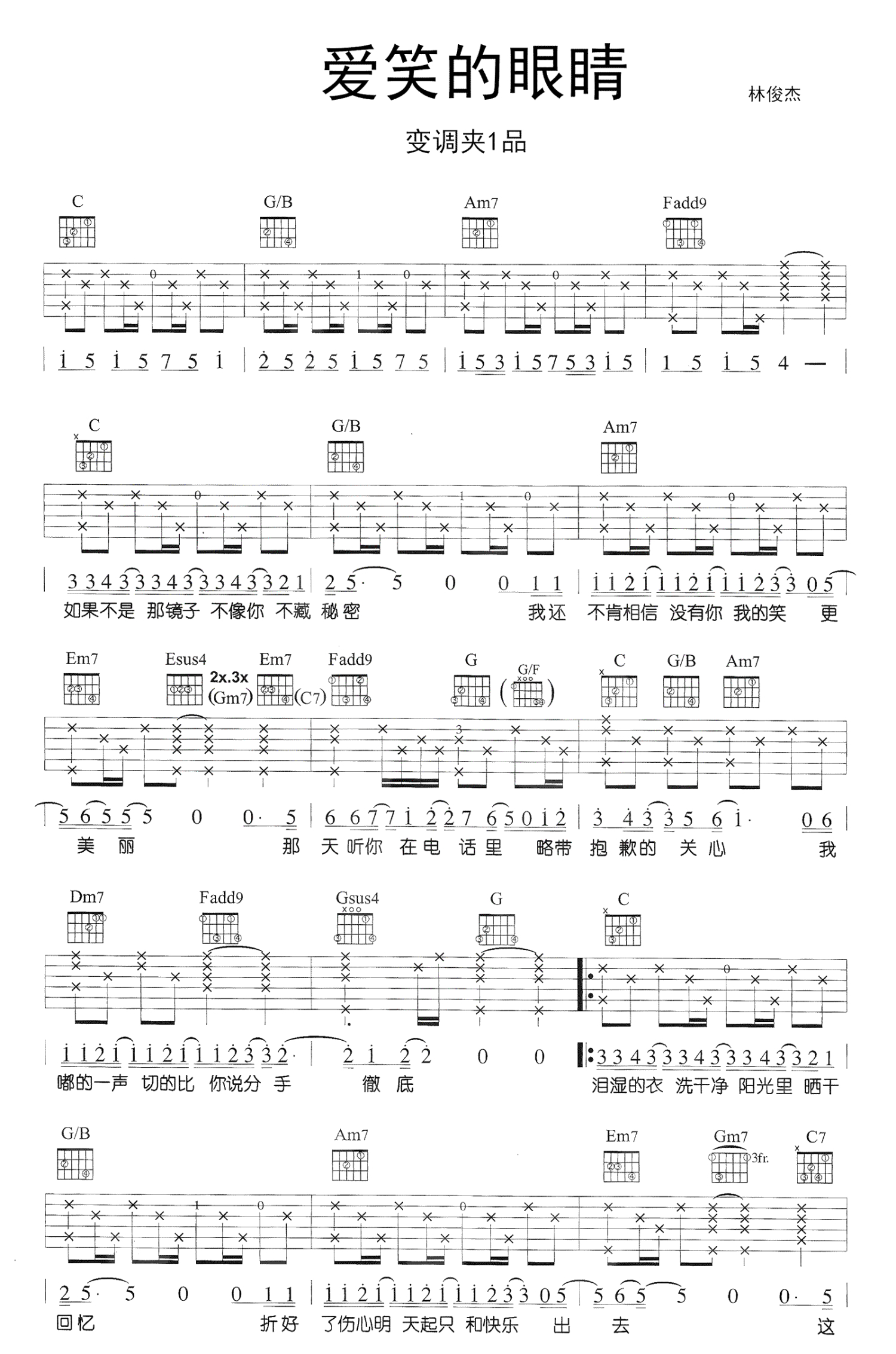 曲谱介绍: 林俊杰《爱笑的眼睛》吉他谱,高清弹唱图片谱,变调夹夹一品,这首歌曲是林俊杰谱曲,徐若瑄填词演唱的一首歌,林俊杰在《她说》专辑中重新演绎了这首歌曲。也许,原创带来的翻唱,可以更加贴近创作者的本心。《梦想的声音2》节目陈卓璇的《爱笑的眼睛》版本也给人留下深刻印象。
