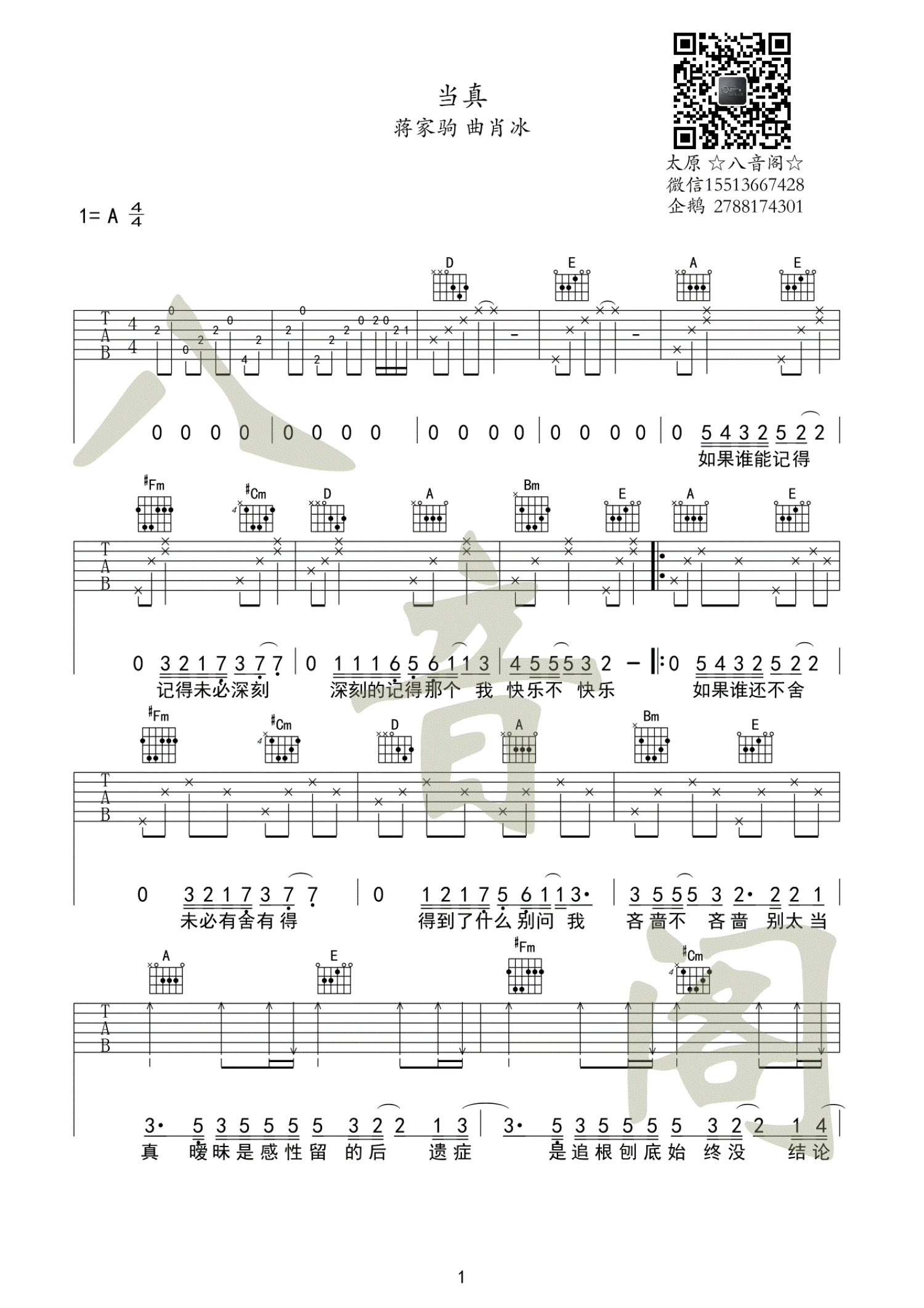 当真吉他谱 - 蒋蒋 - A调吉他弹唱谱