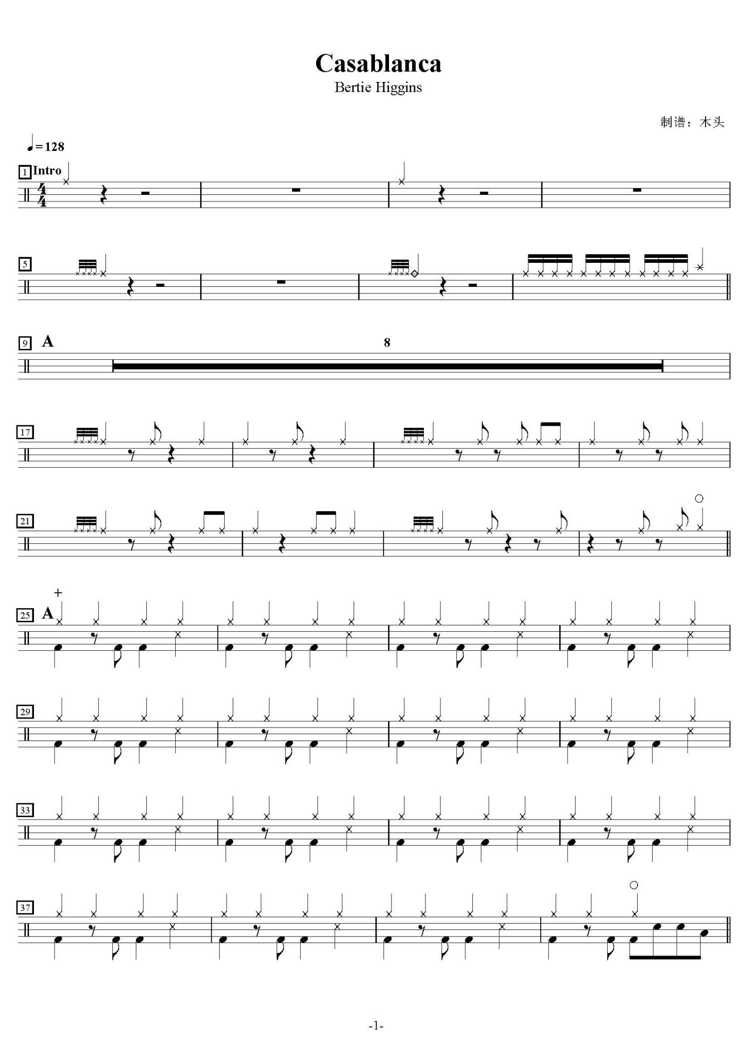 • Casablanca鼓谱 - Bertie Higgins - 架子鼓谱第1张