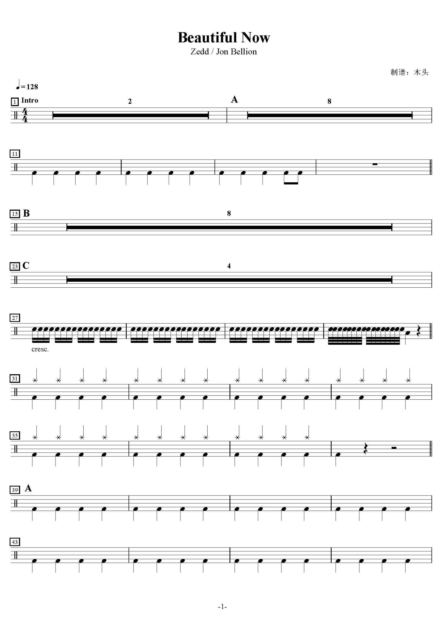• Beautiful Now鼓谱 - Zedd / Jon Bellion - 架子鼓谱第1张