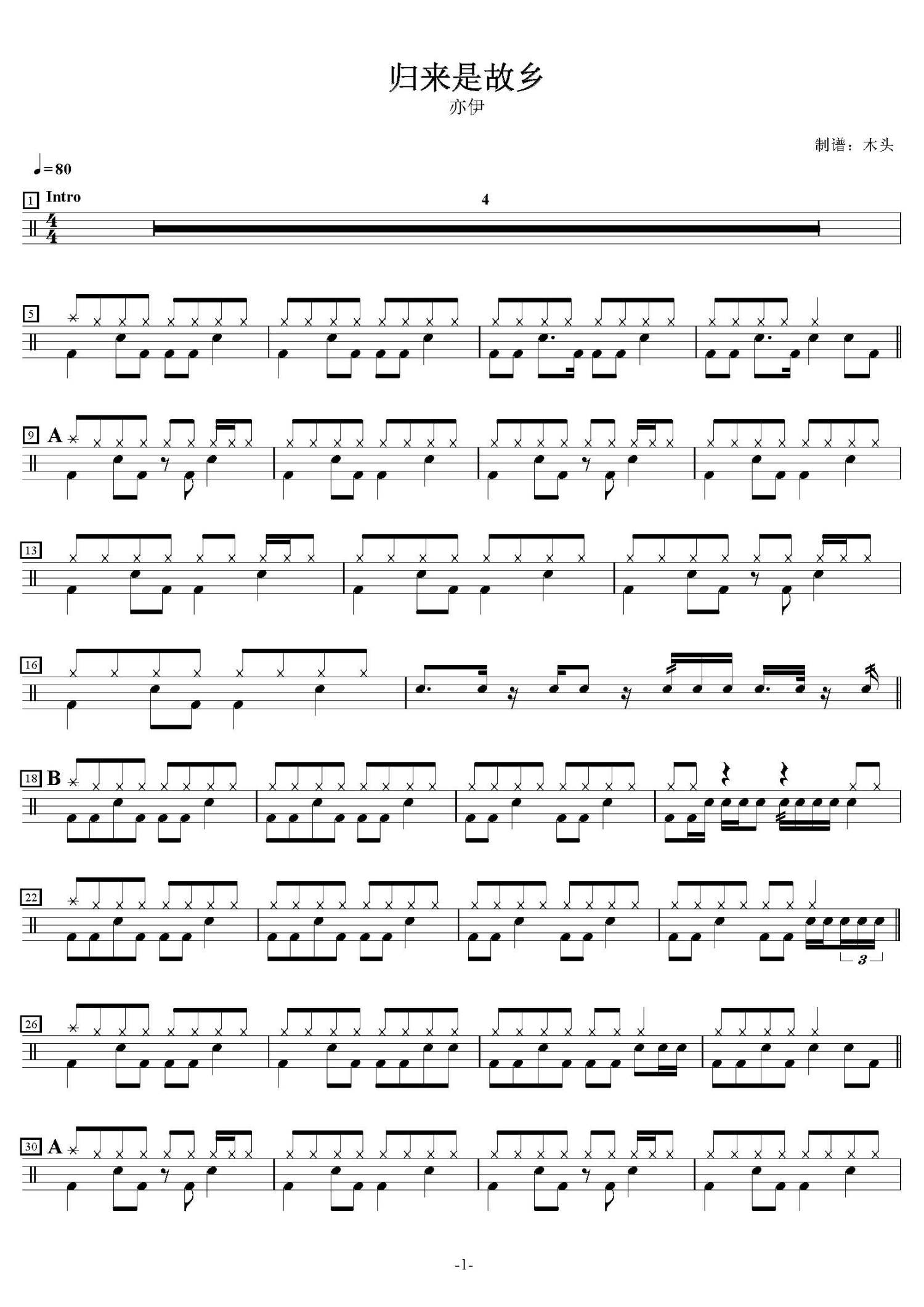 归来是故乡鼓谱 - 亦伊 - 架子鼓谱