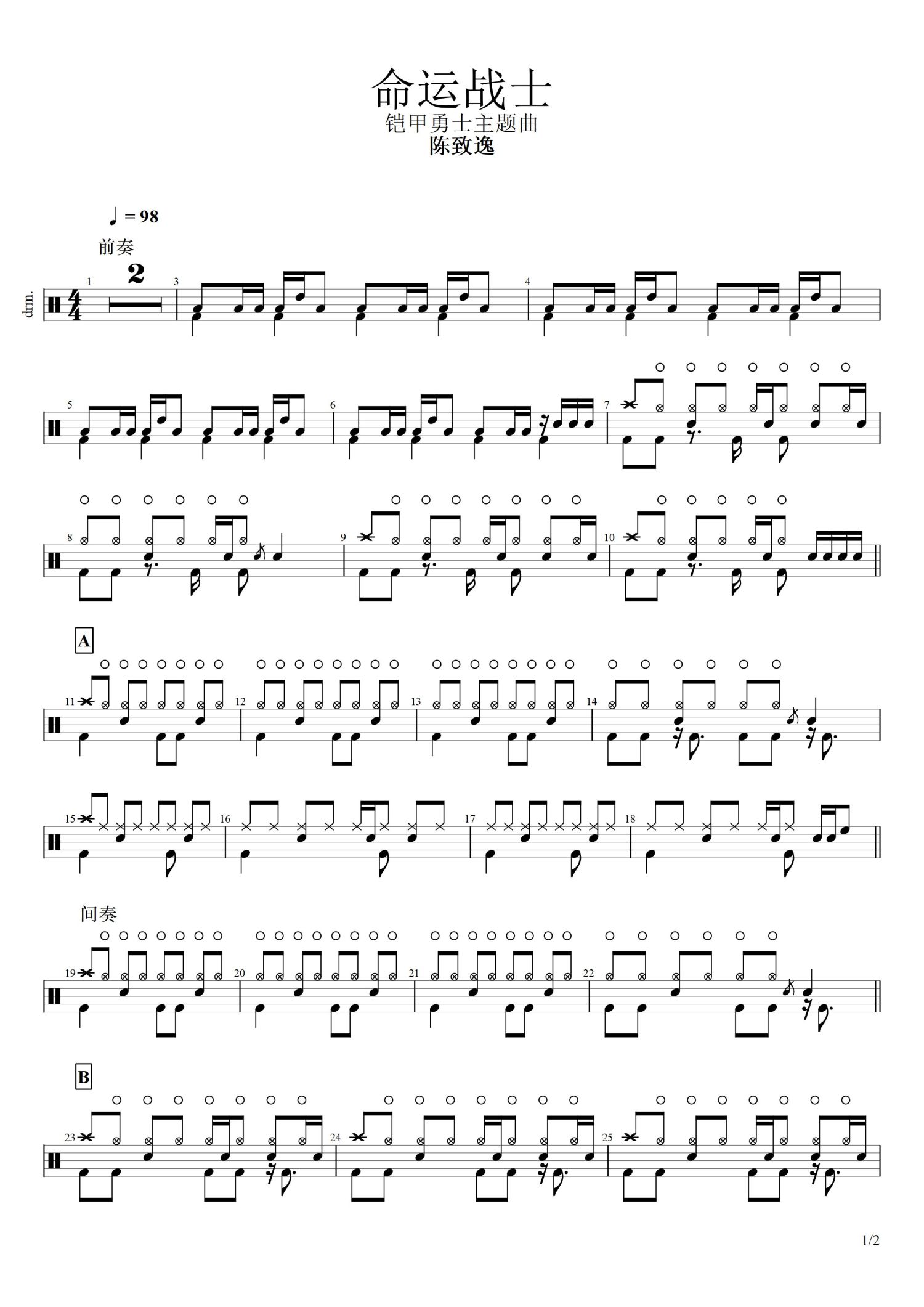 • 命运战士鼓谱 - 陈致逸 - 架子鼓谱第1张