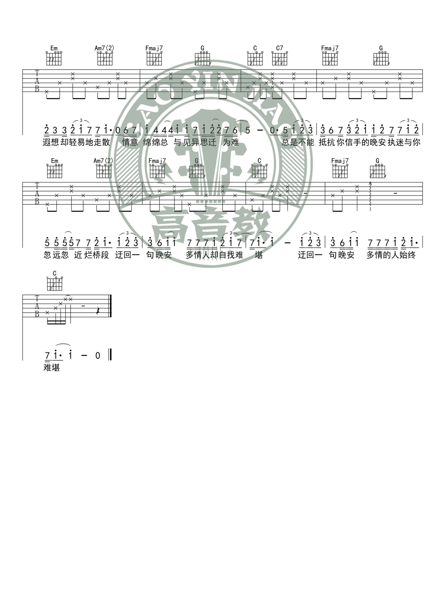 曲谱介绍: 《晚安》是由颜人中演唱的一首歌曲。颜人中演唱的《晚安》, 是继任然演唱的《可最后》和徐秉龙演唱的《胆小鬼》后,由“星辰集”所收录的第三首单曲。 颜人中,出生于1994年6月17日,中国台湾流行乐唱作型男歌手。 窗挡住月色 贪恋的交集 在浮语虚词中交映 忙碌的身影 慢慢的长夜 去匆匆地留下感情 声色太慌张 你眼神逃避 却如此地令人着迷 为何总留恋这种 暧昧的迷离 曾经多少个牵肠拉扯不舍夜晚 到现在热情褪成陌路的感叹 何必拿真心与寂寞去纠缠 几人份的畅谈 道三两句晚安 惹多情的遐想 却轻易地走散 情意绵绵总与见异思迁为难 总是不能抵抗你信手的晚安 执迷与你忽远忽近烂桥段 迂回一句晚安 多情人却自找难堪 声色太慌张 你眼神逃避 却如此地令人着迷 为何总留恋这种 暧昧的迷离 曾经多少个牵肠拉扯不舍夜晚 到现在热情褪成陌路的感叹 何必拿真心与寂寞去纠缠 几人份的畅谈 道三两句晚安 惹多情的遐想 却轻易地走散 情意绵绵总与见异思迁为难 总是不能抵抗你信手的晚安 执迷与你忽远忽近烂桥段 迂回一句晚安 多情人却自找难堪 几人份的畅谈 道三两句晚安 惹多情的遐想 却轻易地走散 情意绵绵总与见异思迁为难 总是不能抵抗你信手的晚安 执迷与你忽远忽近烂桥段 迂回一句晚安 多情人却自找难堪 迂回一句晚安 多情的人始终难堪