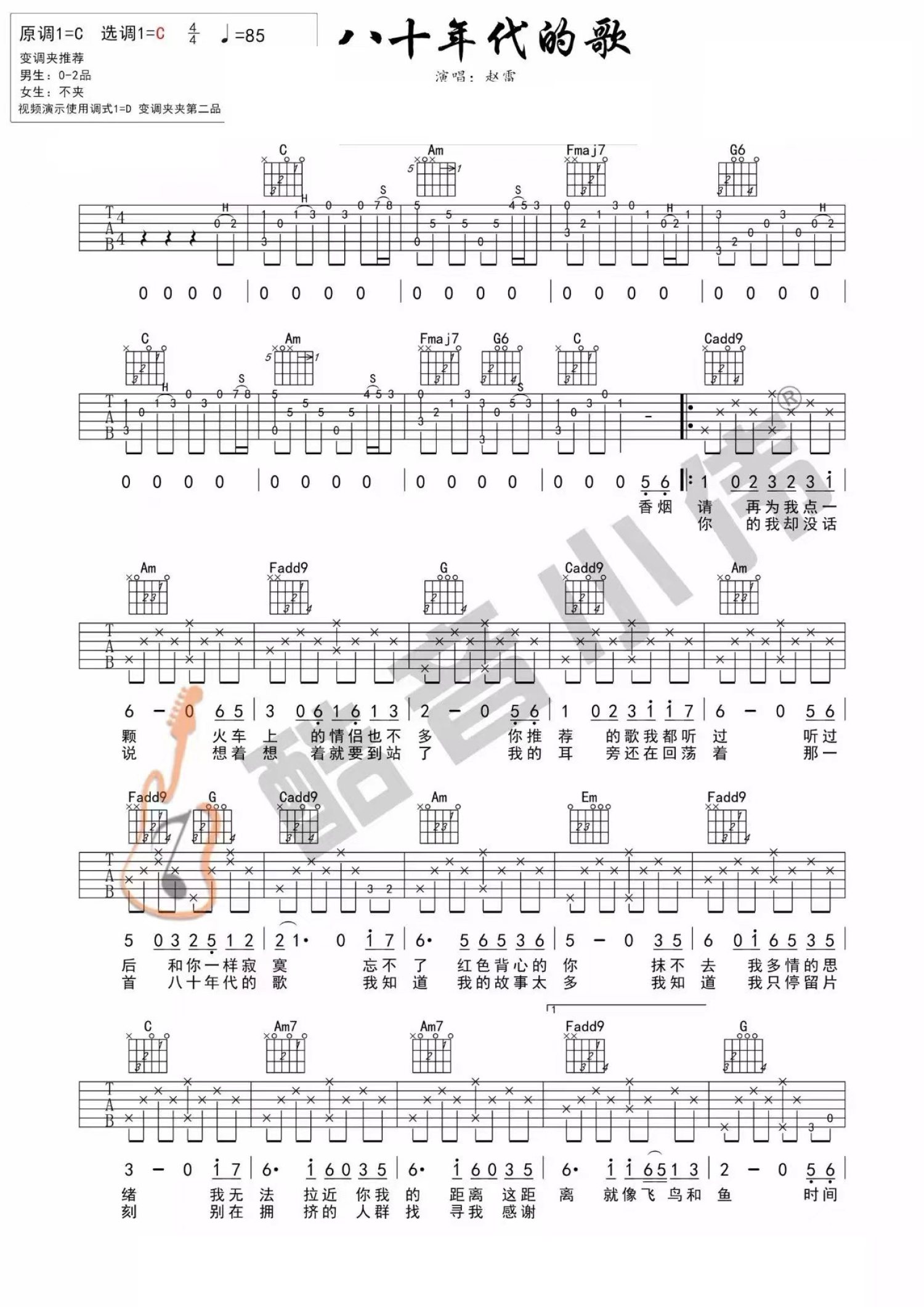 曲谱介绍: 赵雷《八十年代的歌》吉他弹唱谱,采用C调指法编配,共有3张高清图谱。