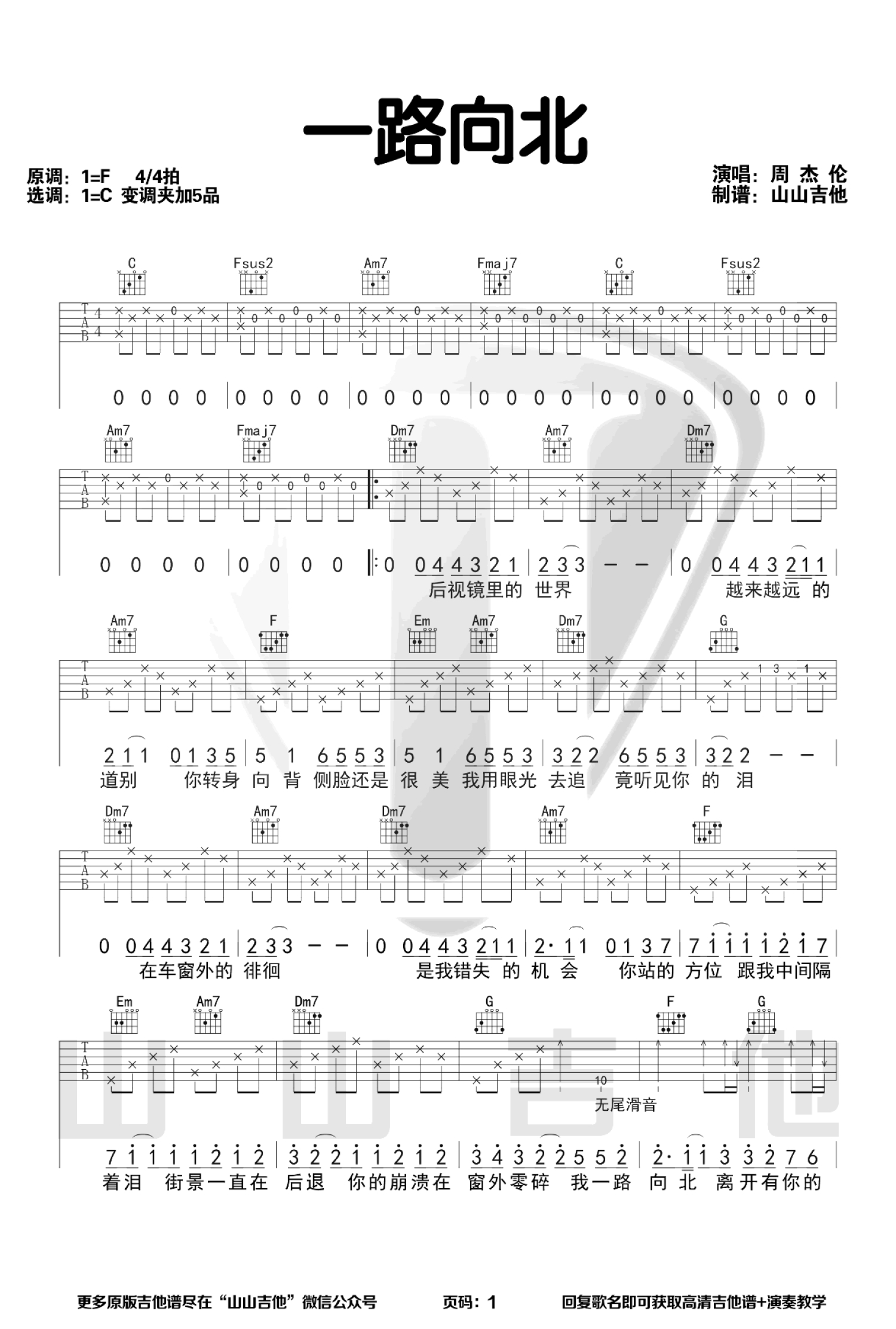 曲谱介绍: 周杰伦《一路向北》吉他弹唱谱,采用C调指法编配,山山吉他编配出品,共有2张高清图谱,免翻页排版设计。