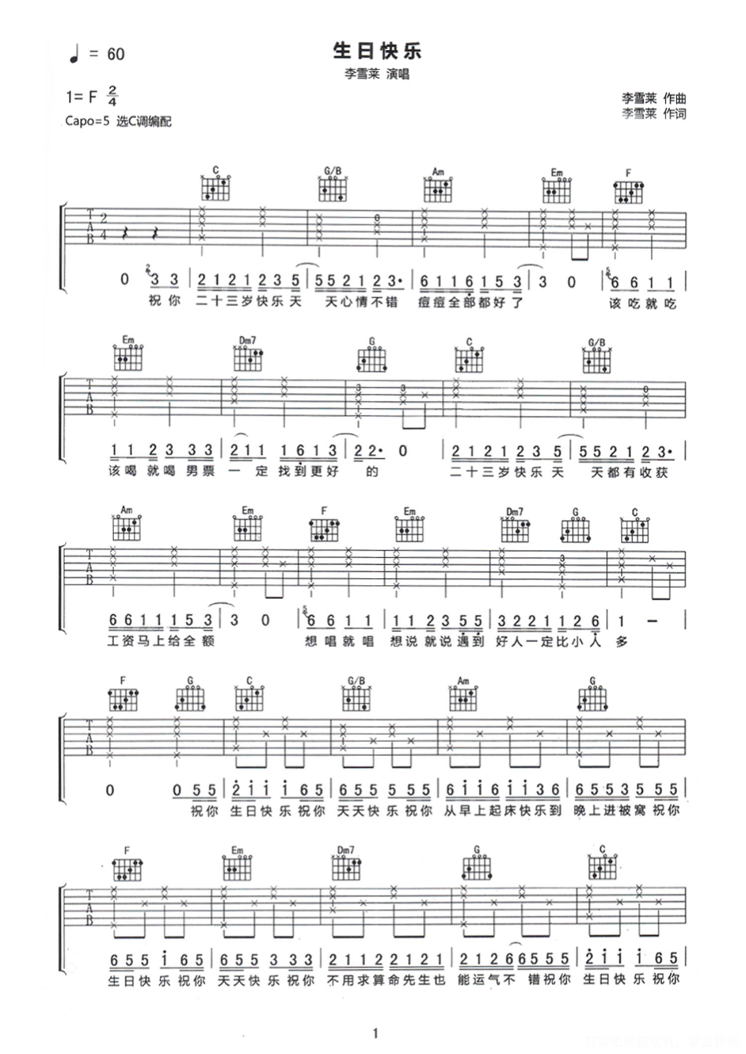 曲谱介绍: 李雪莱《生日快乐》吉他弹唱谱,共有2张高清图谱,免翻页排版设计。