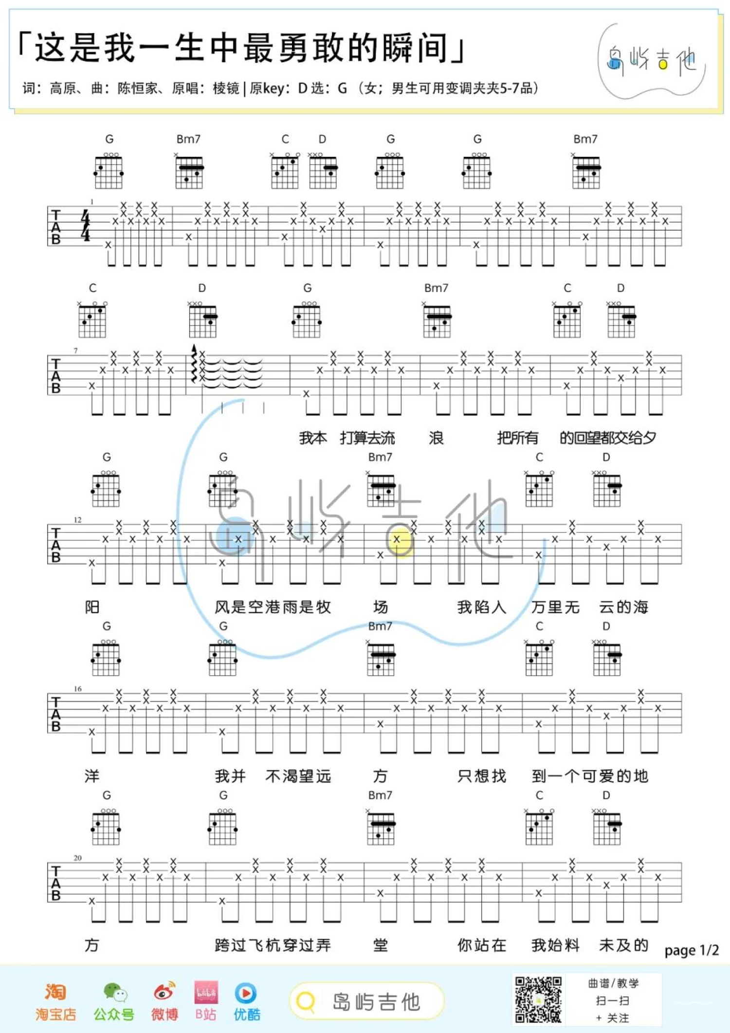 曲谱介绍: 棱镜《这是我一生中最勇敢的瞬间》吉他弹唱谱,岛屿吉他编配出品,共有2张高清图谱,免翻页排版设计。