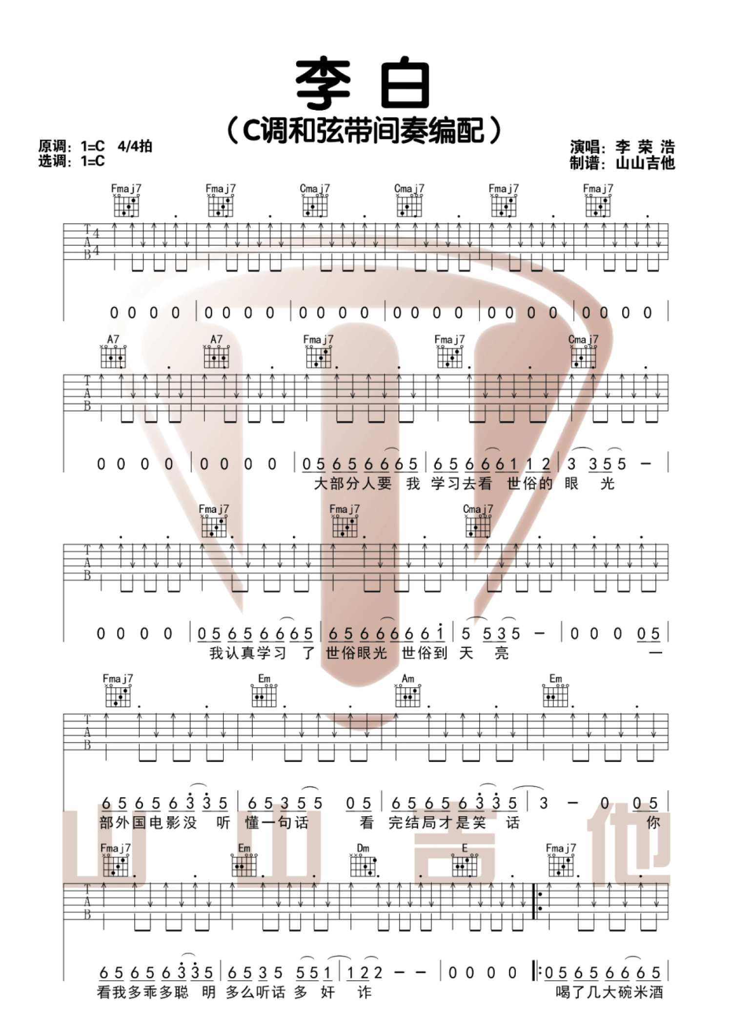 曲谱介绍: 李荣浩《李白》吉他弹唱谱,采用C调指法编配,共有3张高清图谱。