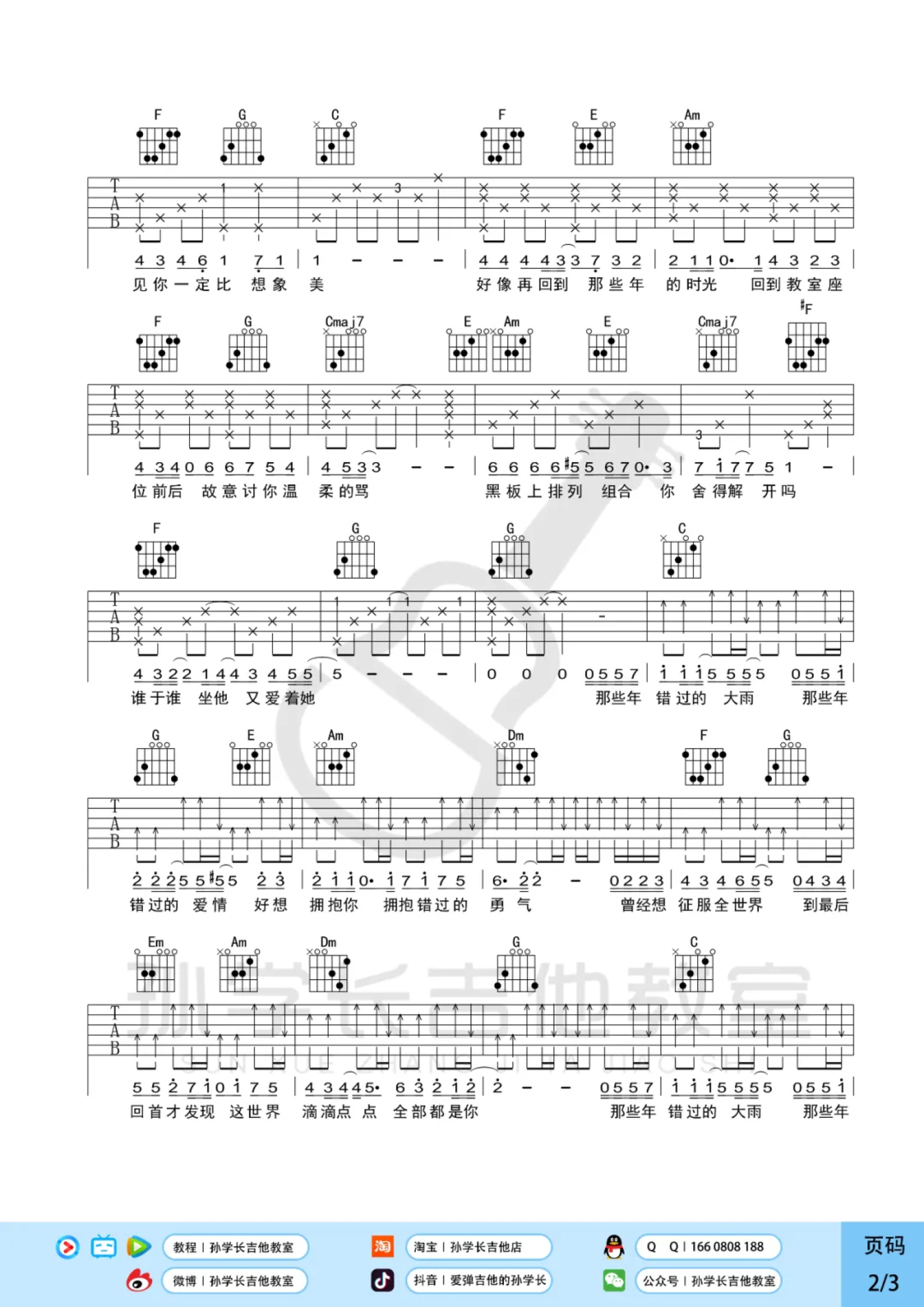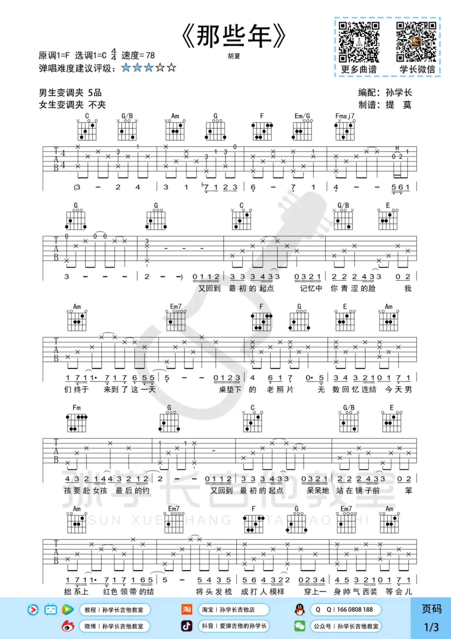 曲谱介绍: 胡夏《那些年》吉他弹唱谱,采用C调指法编配,孙学长吉他教师编配出品,共有3张高清图谱。