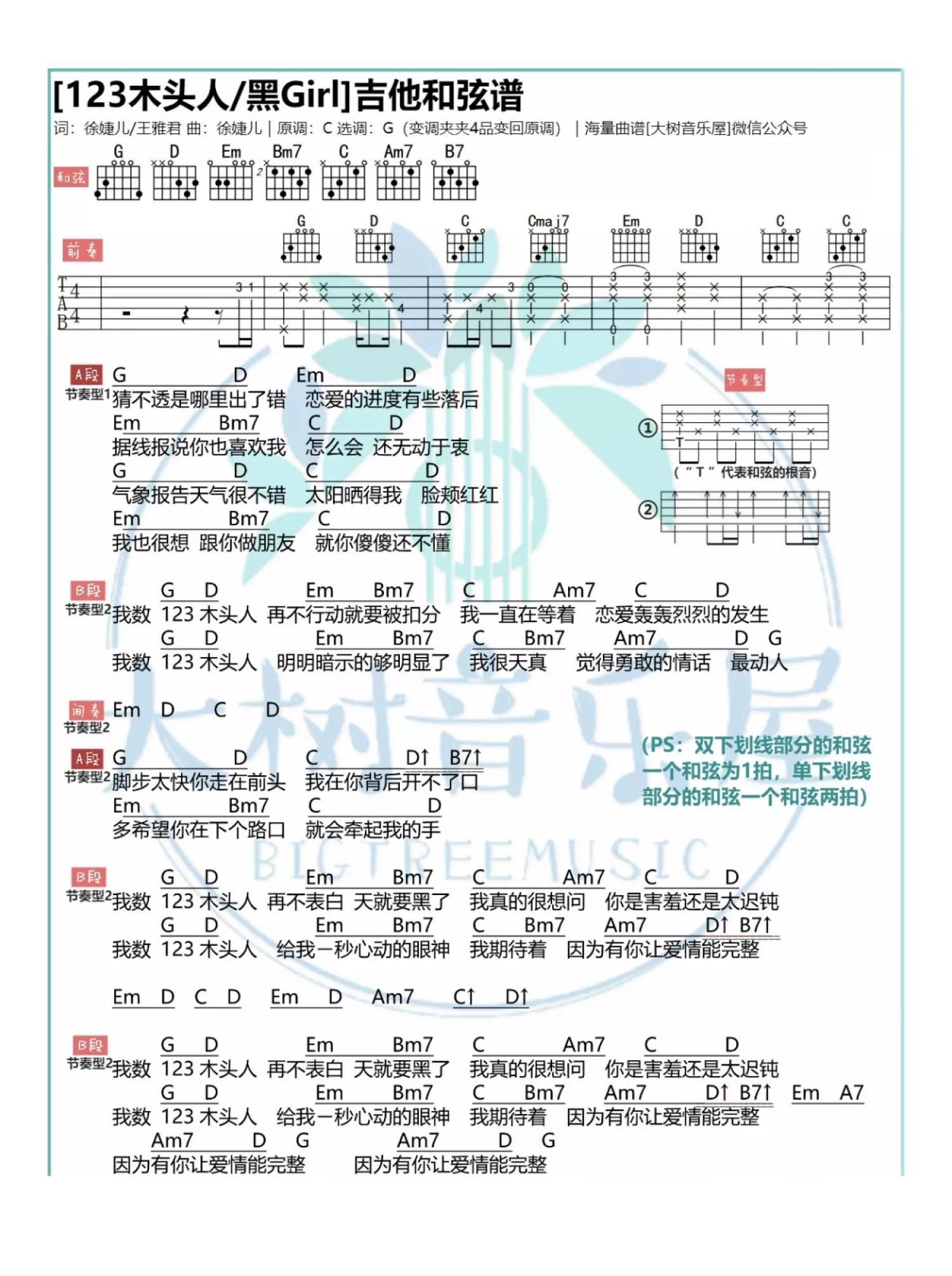 123木头人吉他谱 - 黑GIRL - C调吉他弹唱谱 - 和弦谱
