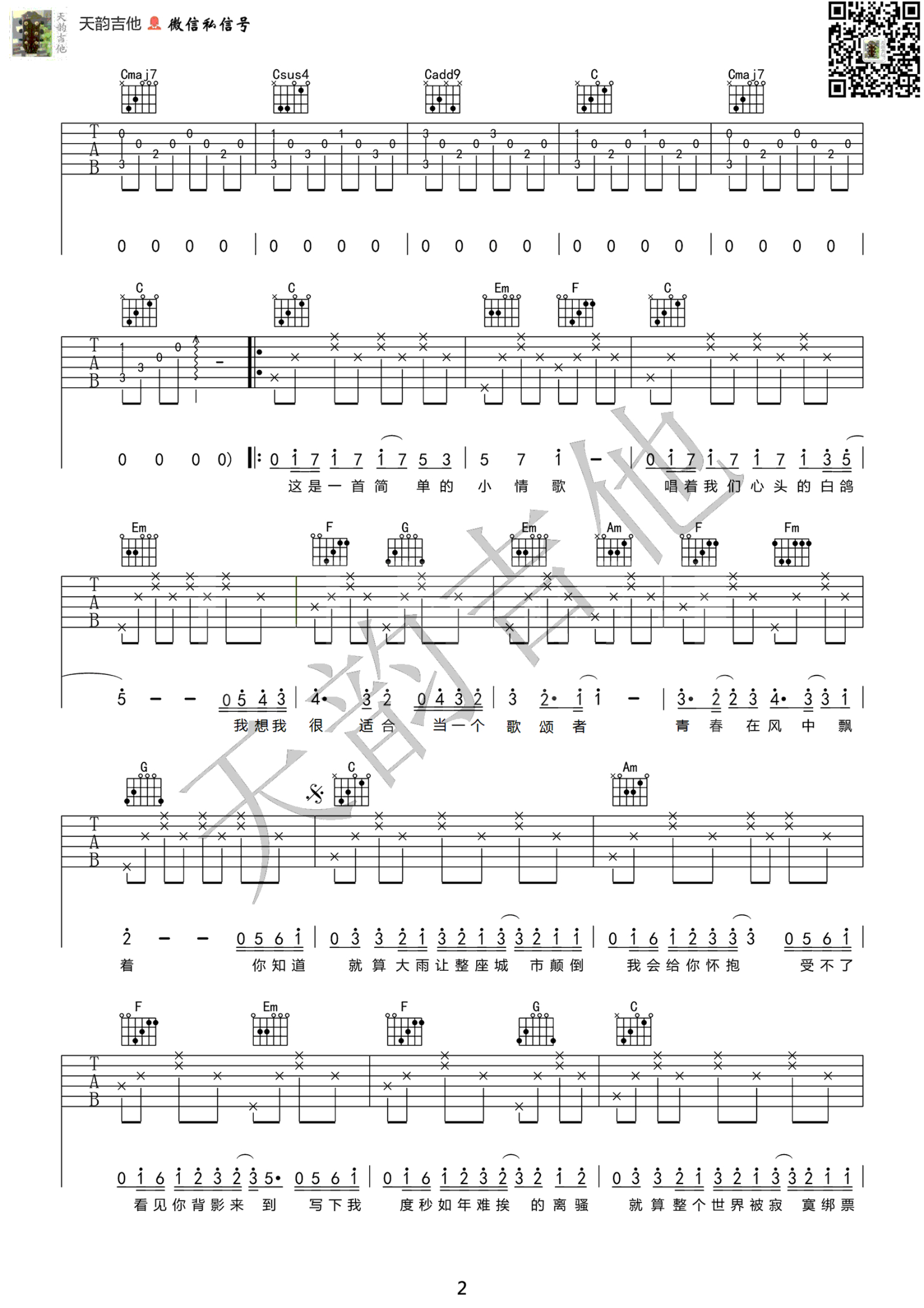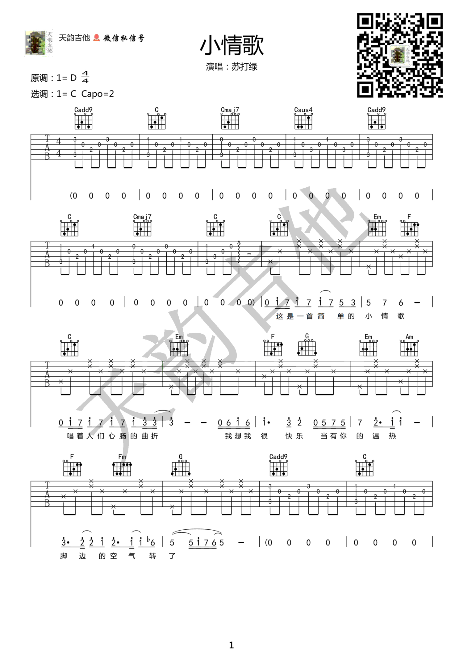 曲谱介绍: 苏打绿《小情歌》吉他弹唱谱,天韵吉他编配出品,共有3张高清图谱。