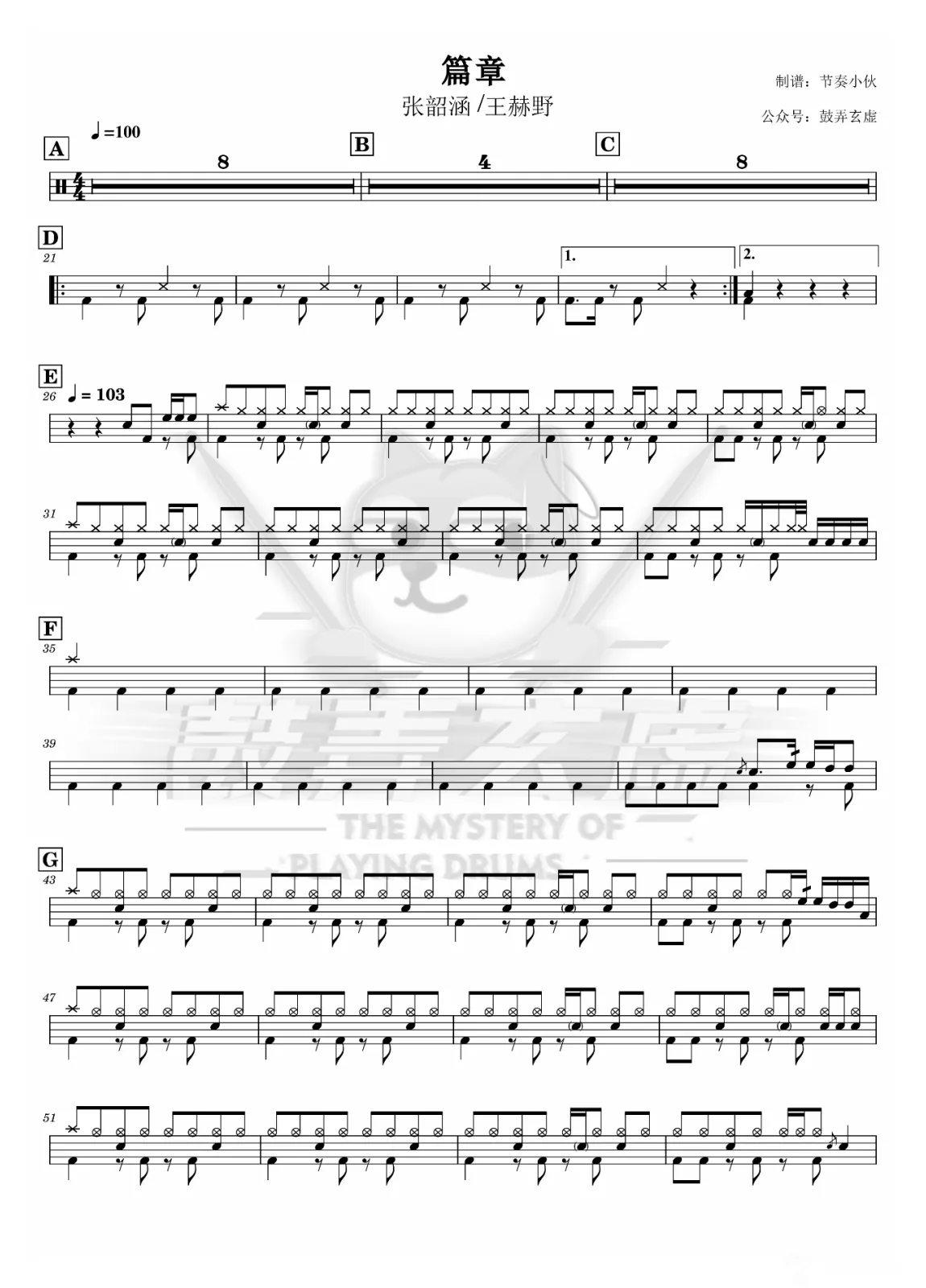 曲谱介绍: 张韶涵/王赫野《篇章》架子鼓谱,鼓弄玄虚编配出品,共有2张高清图谱,免翻页排版设计。