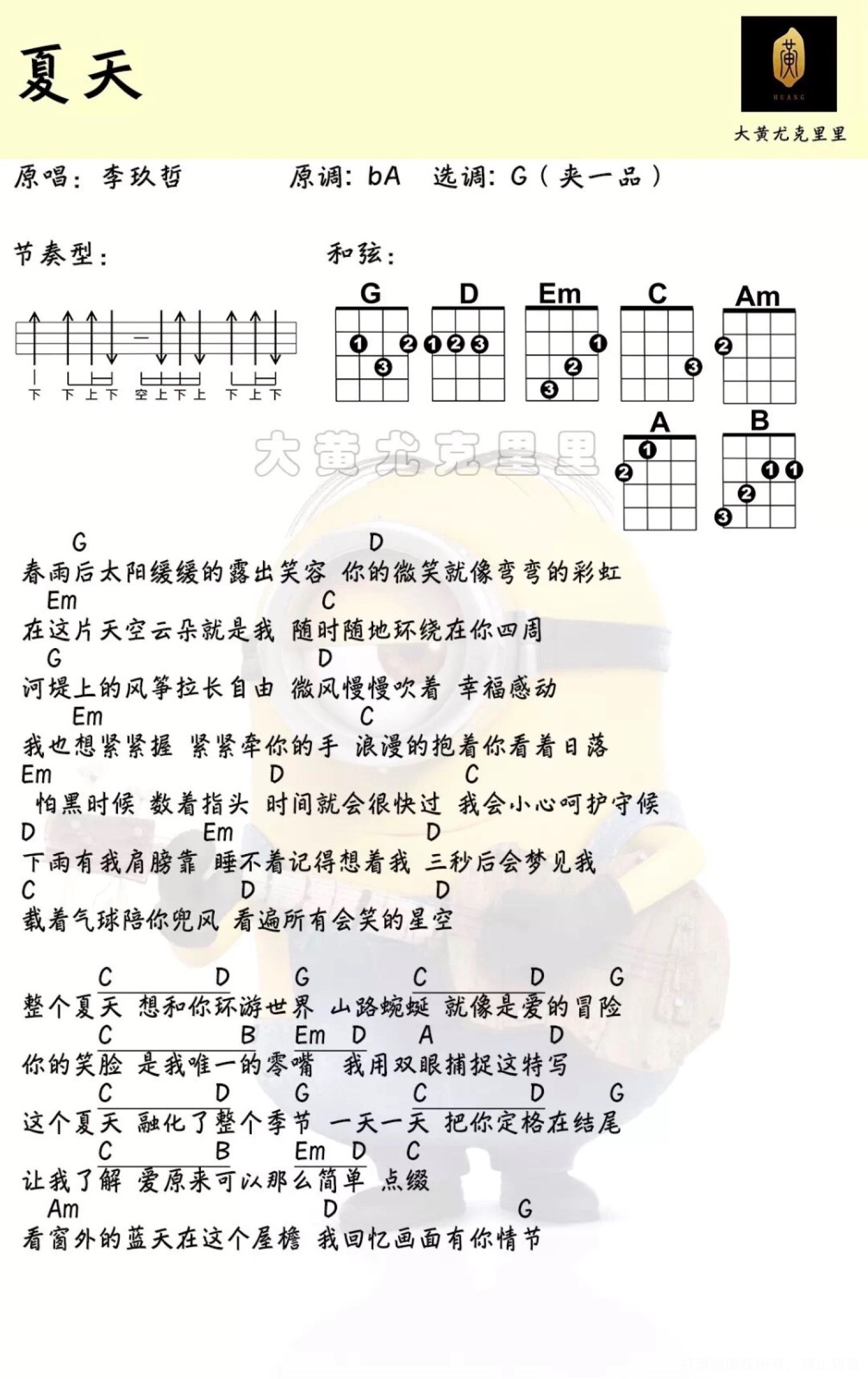曲谱介绍: 《夏天》李玖哲尤克里里弹唱曲谱