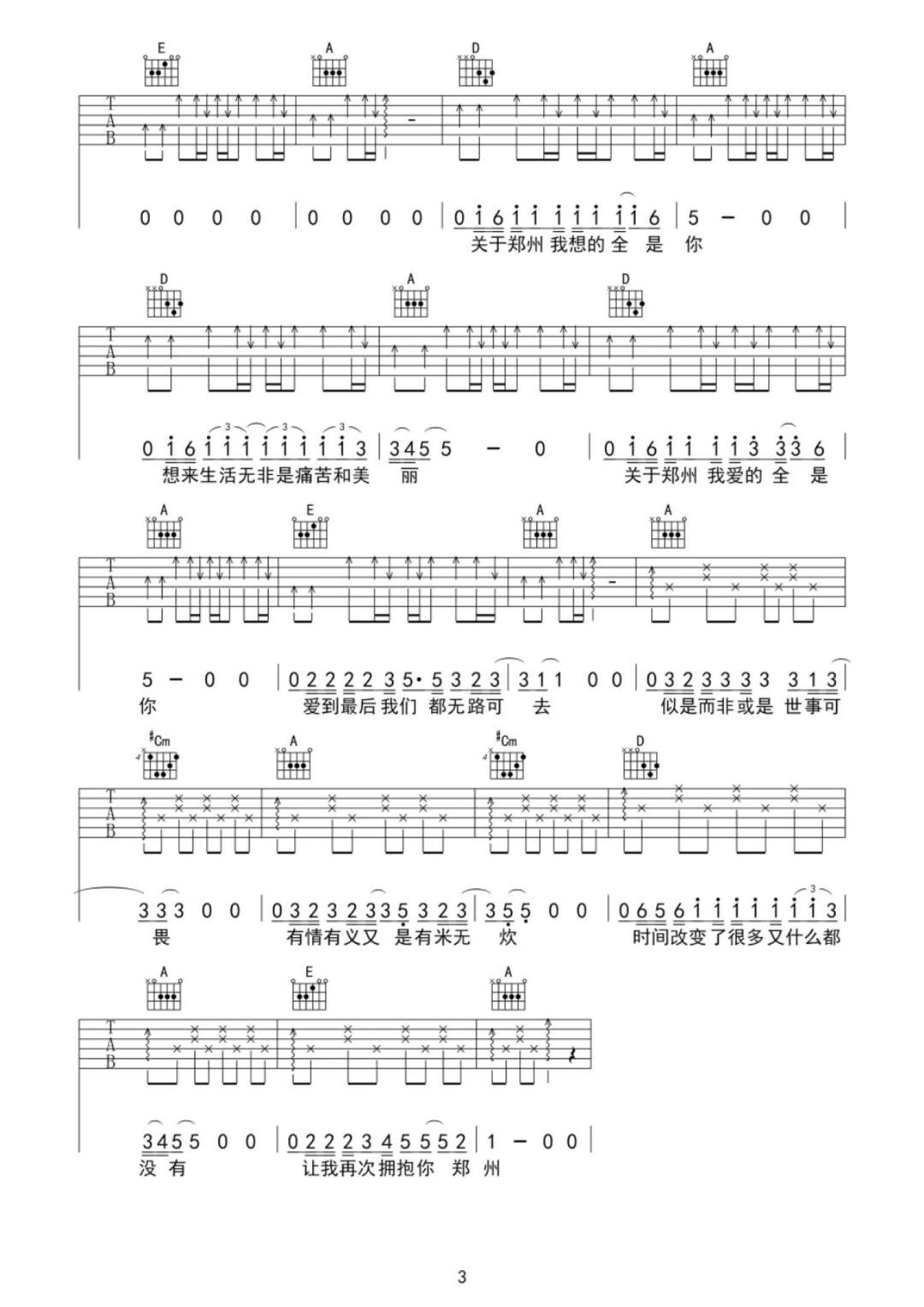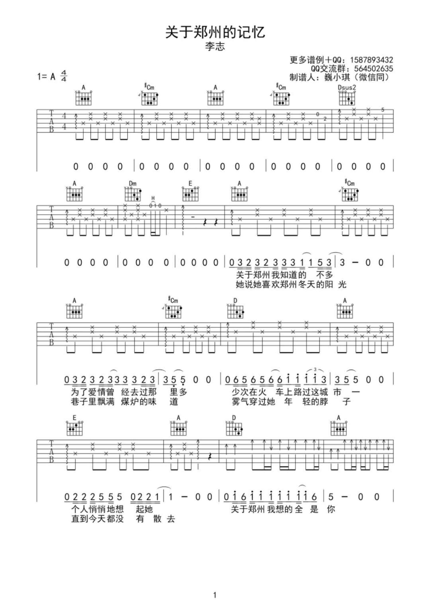 曲谱介绍: 李志《关于郑州的记忆》吉他弹唱谱,采用A调指法编配,魏小琪编配出品,共有3张高清图谱。