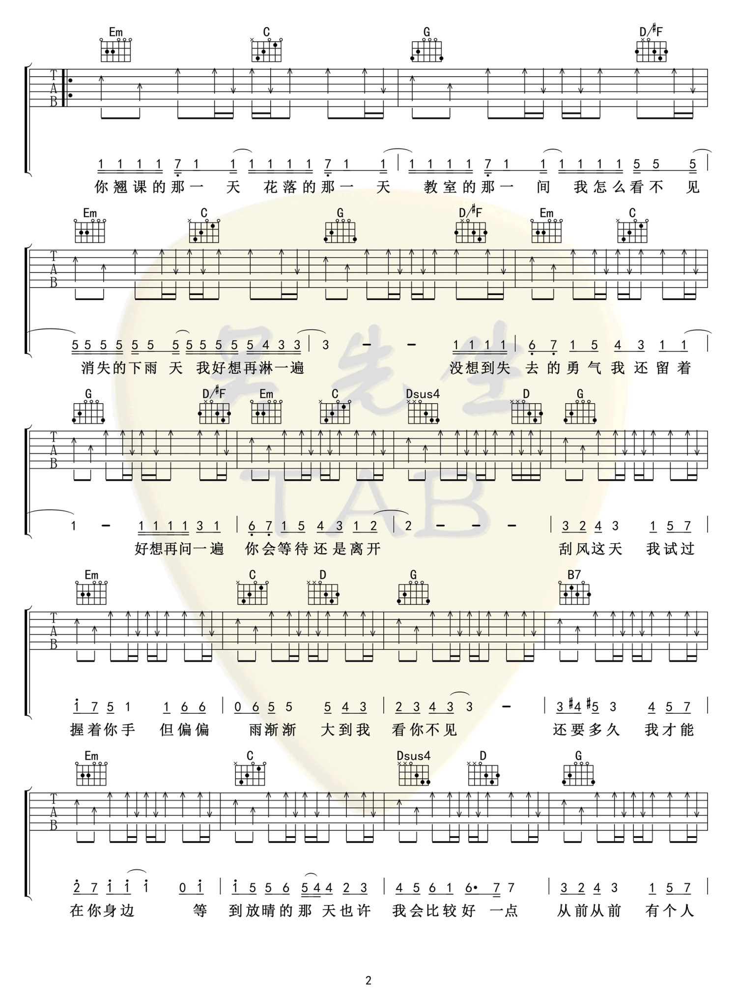曲谱介绍: 周杰伦《晴天》吉他弹唱谱,共有3张高清图谱。