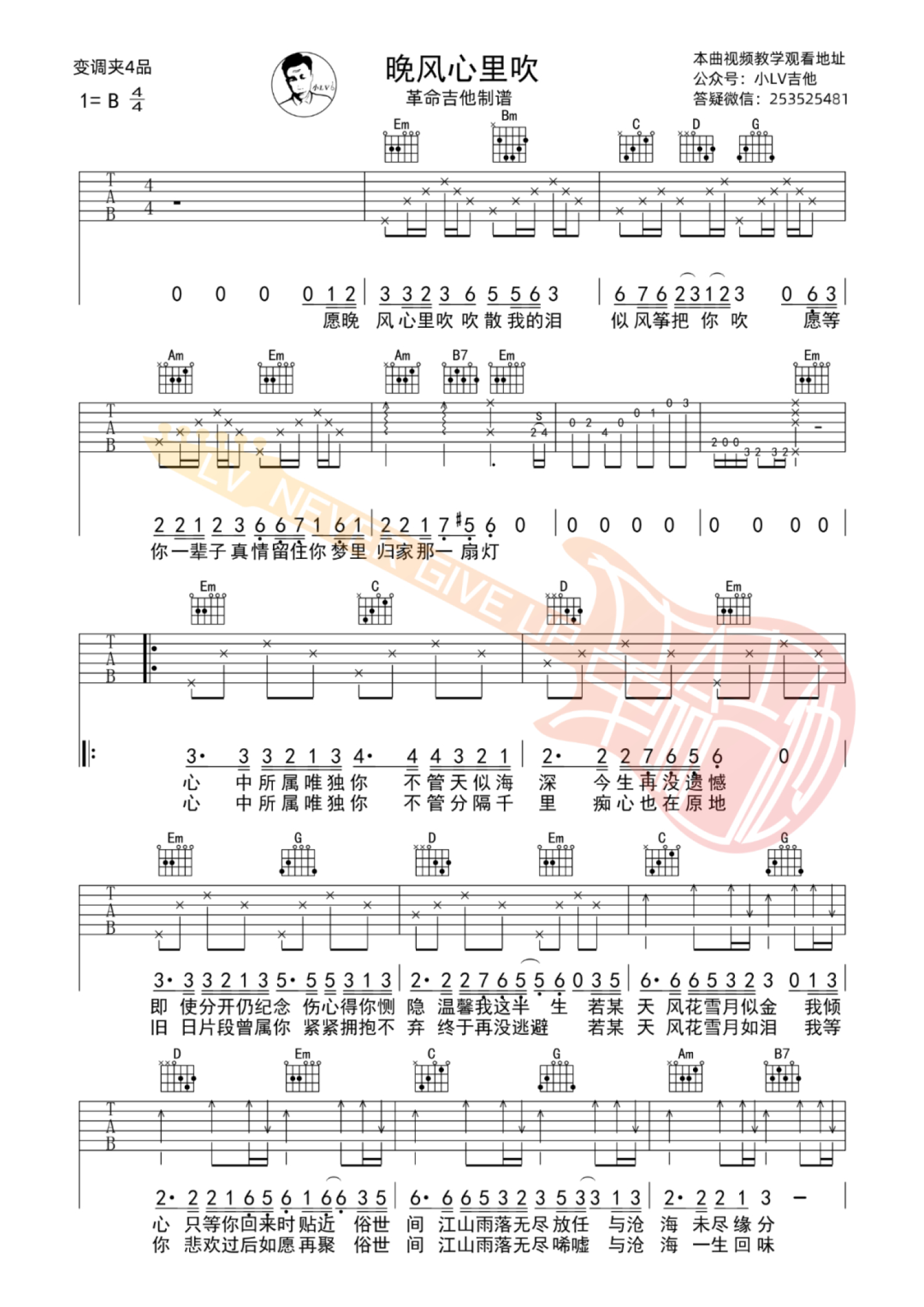 曲谱介绍: 阿梨粤《晚风心里吹》吉他弹唱谱,采用G调指法编配,革命吉他编配出品,共有3张高清图谱。