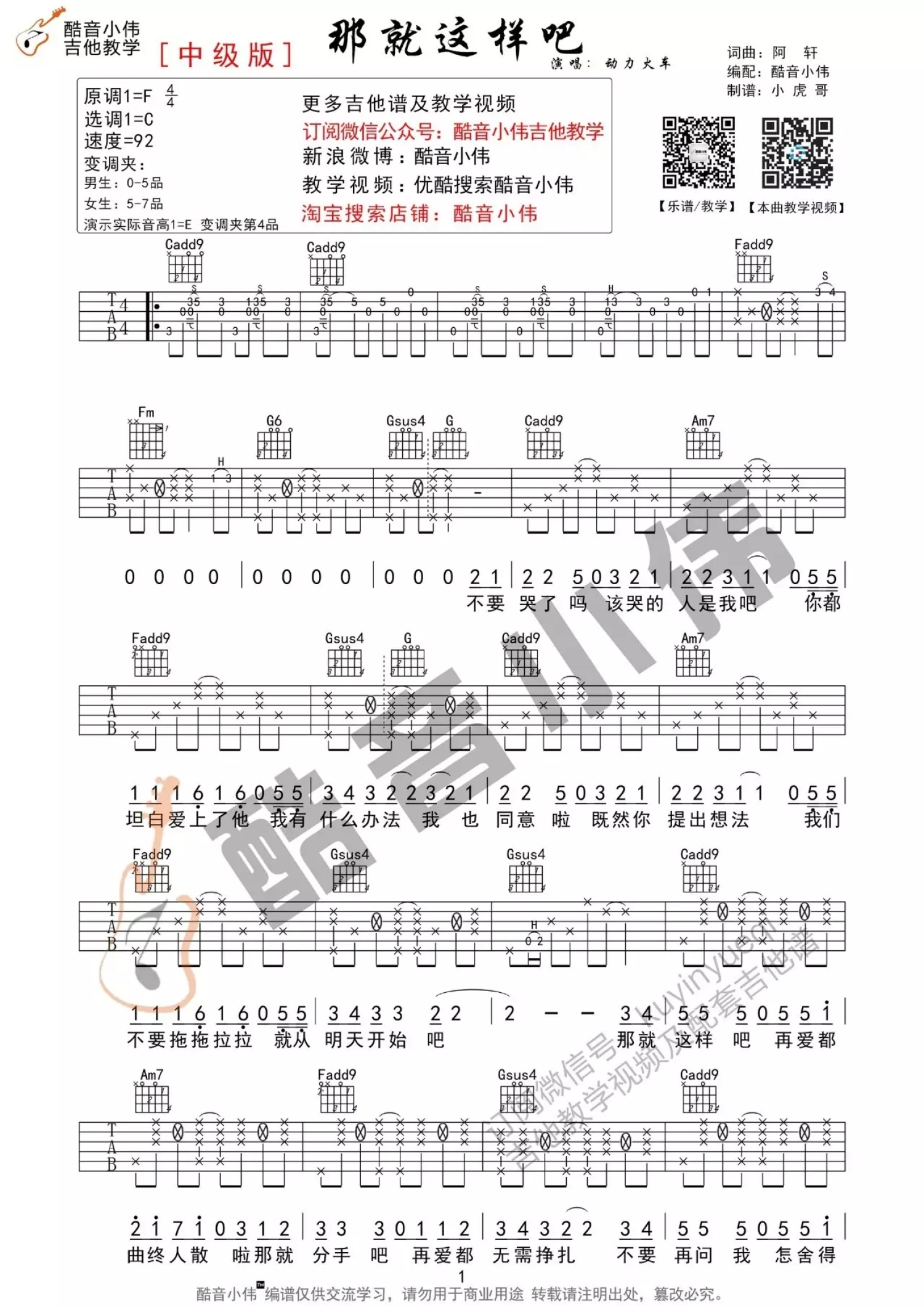 曲谱介绍: 动力火车《那就这样吧》吉他弹唱谱,采用C调指法编配中级版,酷音小伟编配出品,共有3张高清图谱。