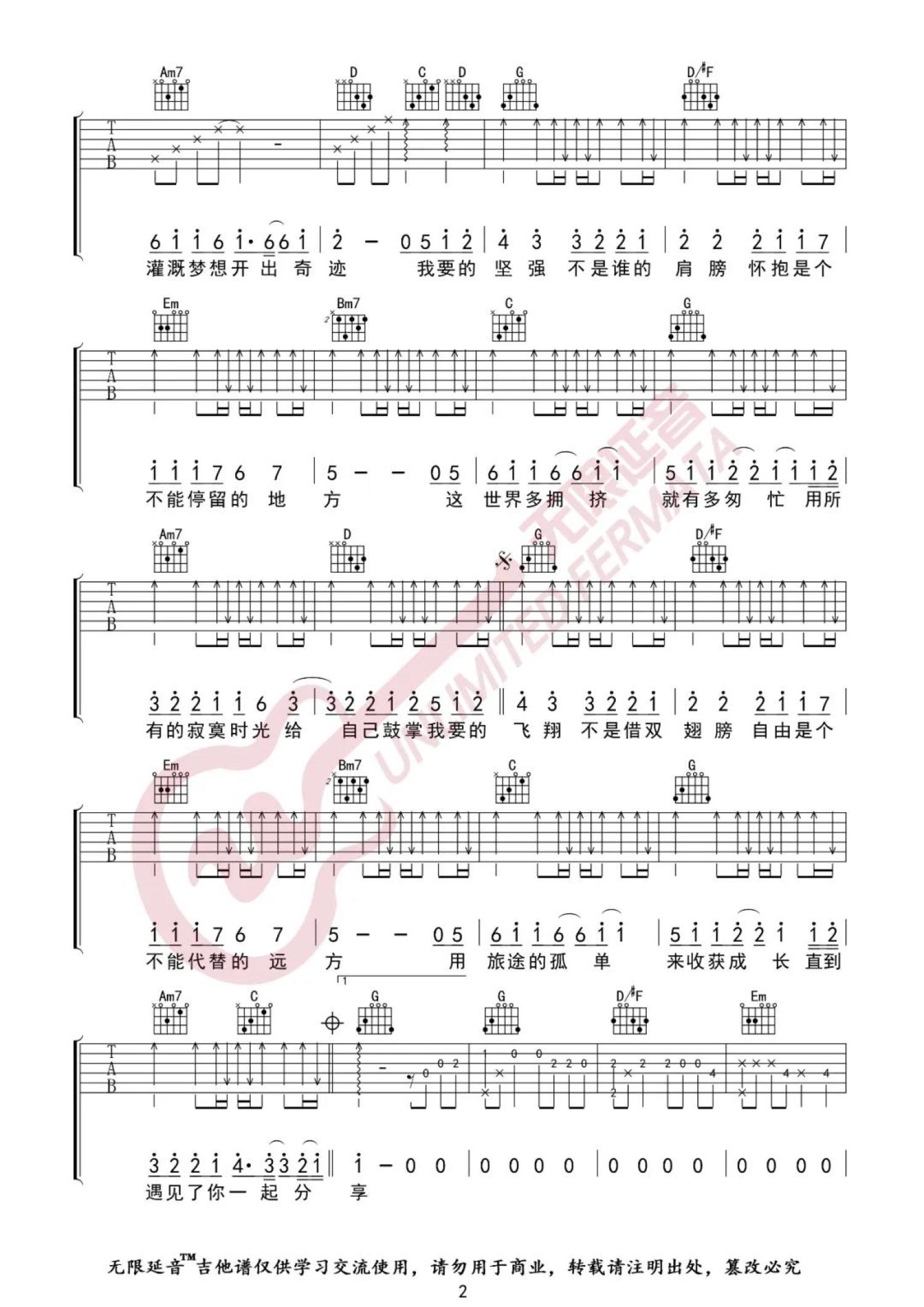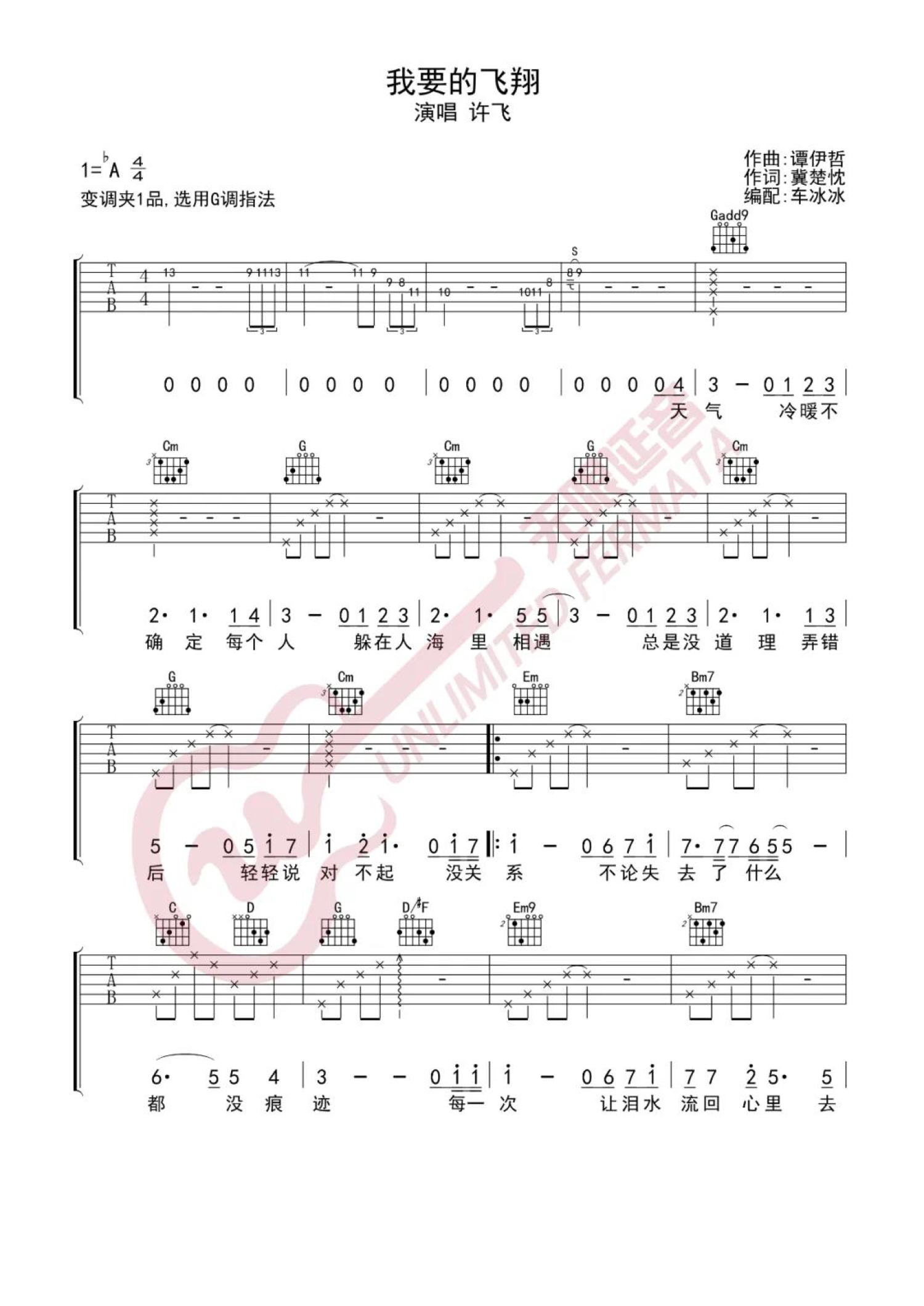 曲谱介绍: 许飞《我要的飞翔》吉他弹唱谱,采用G调指法编配,无限延音编配出品,共有3张高清图谱。
