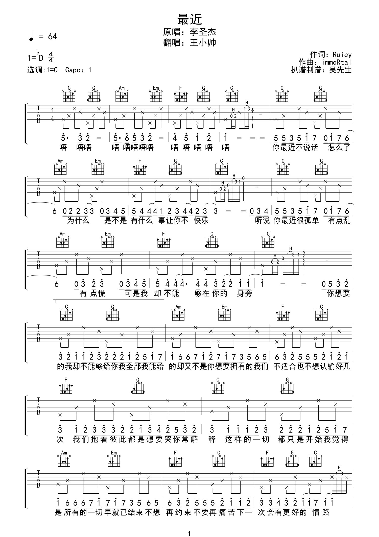 • 最近吉他谱 - 李圣杰 /王小帅 - C调吉他弹唱谱第1张