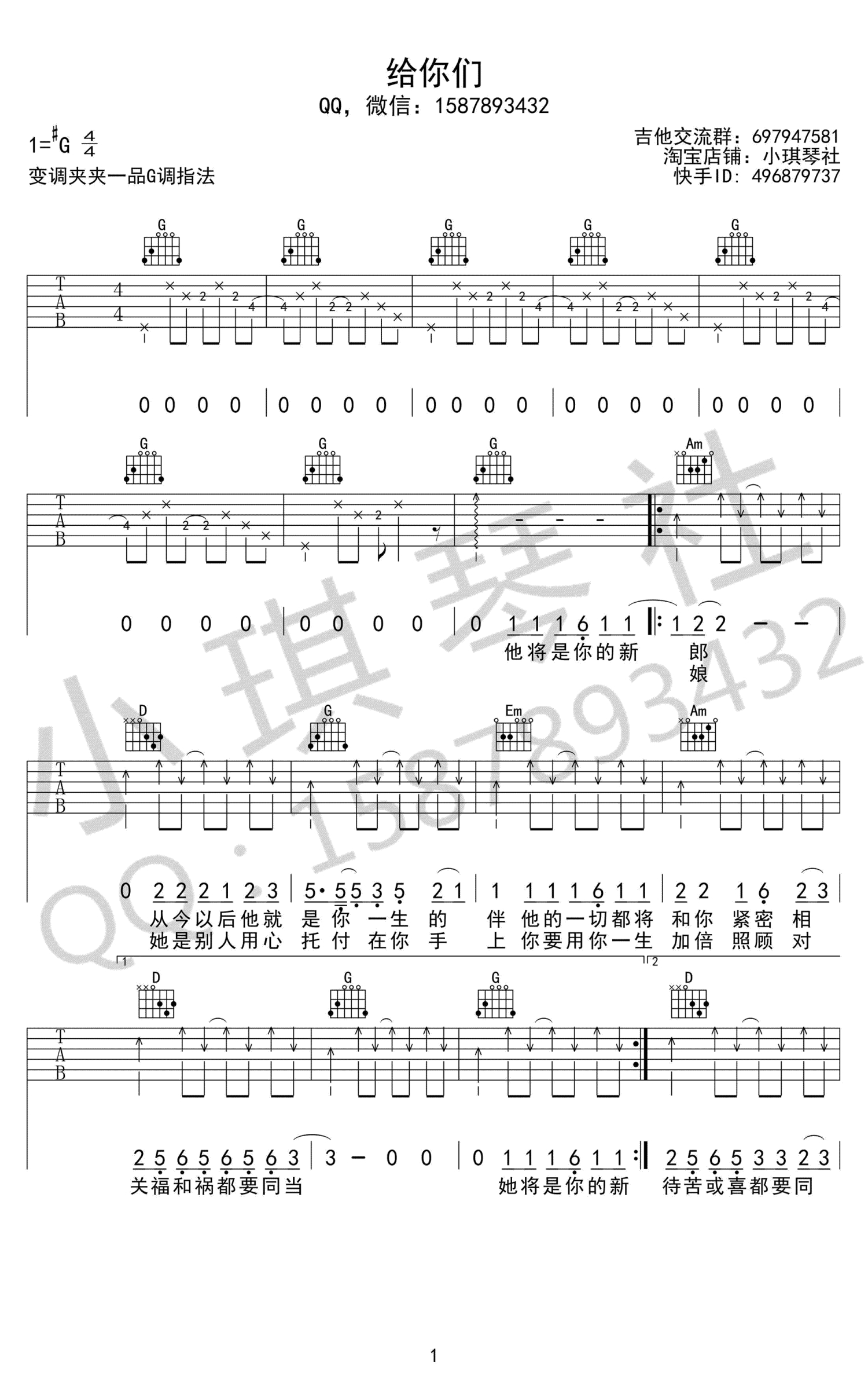 曲谱介绍: 张宇《给你们》吉他谱,G调指法弹唱谱。张宇的一首经典感人的结婚神曲祝福情歌,给你们六线谱,小琪琴社编配出品,吉他天下网站上传推荐。爱情是两个人相互扶持和体谅,一首婚礼上很合适的音乐,每次听都很幸福感伤,相信每一对牵手的人都很憧憬这样的场面吧。