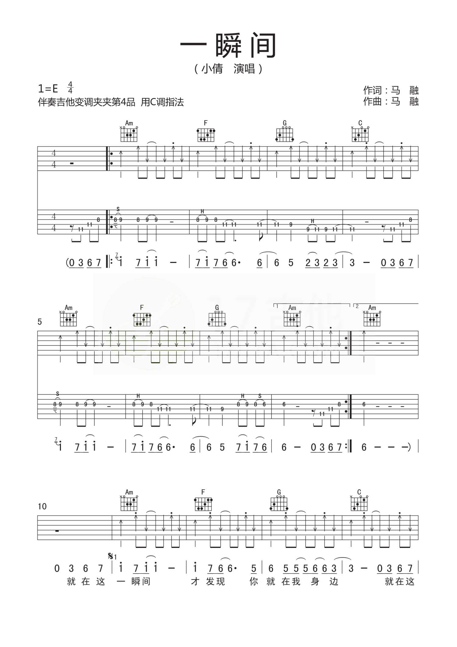曲谱介绍: 丽江小倩《一瞬间》吉他谱_C调吉他弹唱谱_原版双吉他伴奏